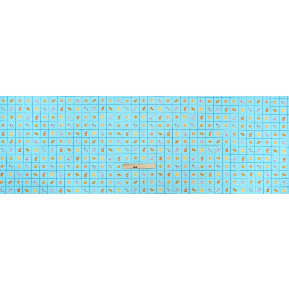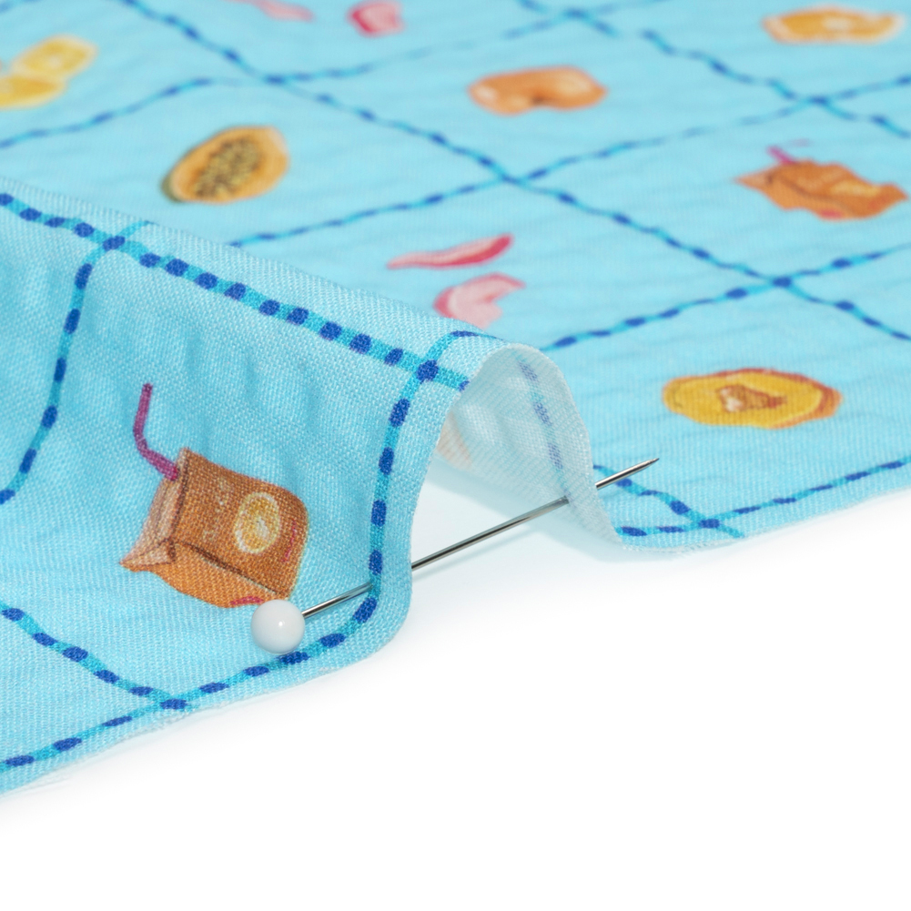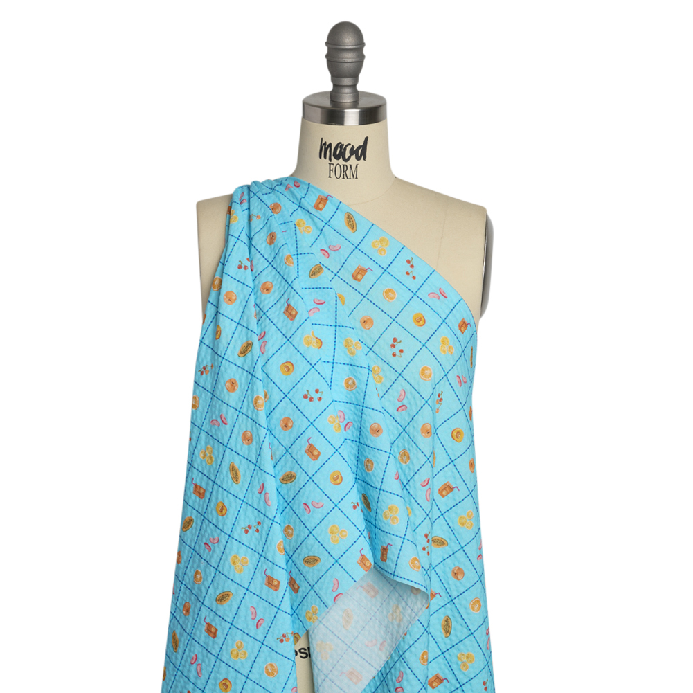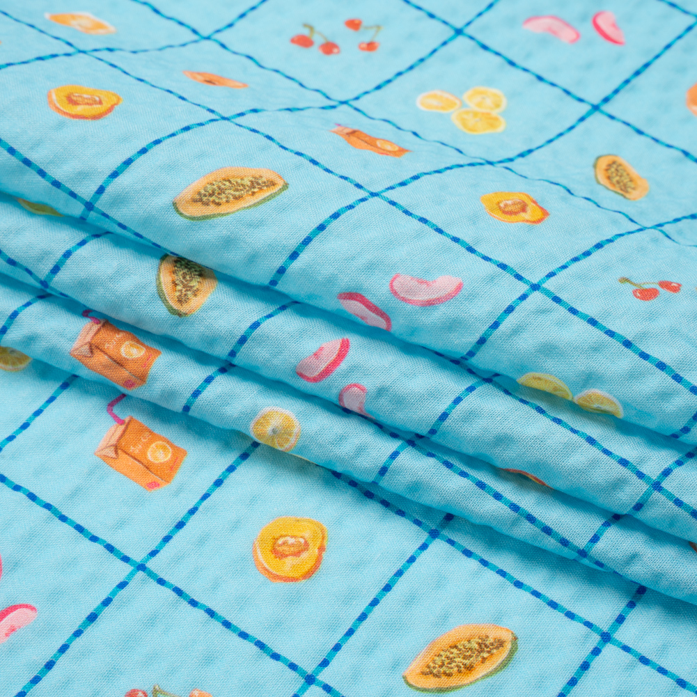 Cotton and Viscose Striped Seersucker Print - Blue Windowpane Checks and Fruit - Mood Exclusive Fruit Juice Jackpot