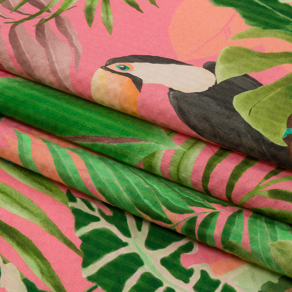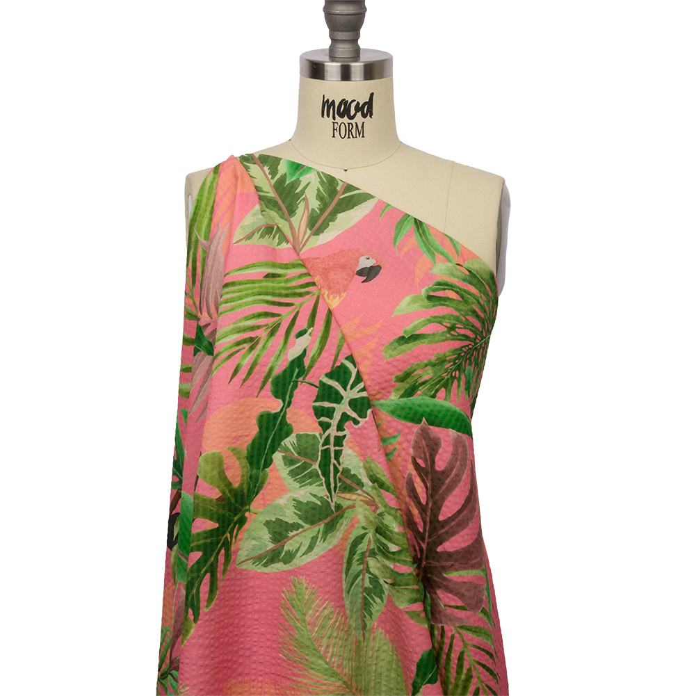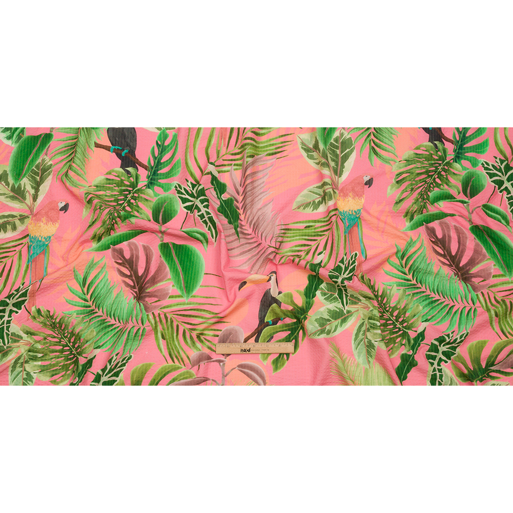 As the sun sets the sky ablaze, our Mood Exclusive Birds of Paradise Cotton and Viscose Striped Seersucker begins to wake. Macaws and toucans perch on tropical foliage of green and purple hues, growing against a deep pink sky. Prized for its lightweight, breathable qualities, seersucker is noted for its tone-on-tone stripes, created via pulling and loosening threads during the weaving process. Airy and fluttering in drape, we suggest lightweight blazers, playful pants, jumpsuits, or billowing skirts. Somewhat translucent, a lining may be desired for full opacity.MoodEarth Verified: BCI, or Better Cotton Initiative, focuses on the exchange of good practices, including economic, environmental, and social concerns, in the production of cotton. For more information on Mood's sustainability initiatives, check out MoodEarth here.