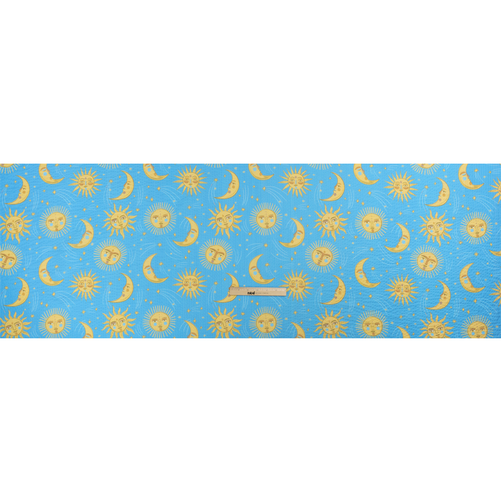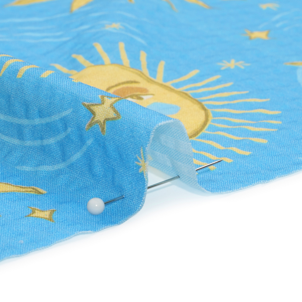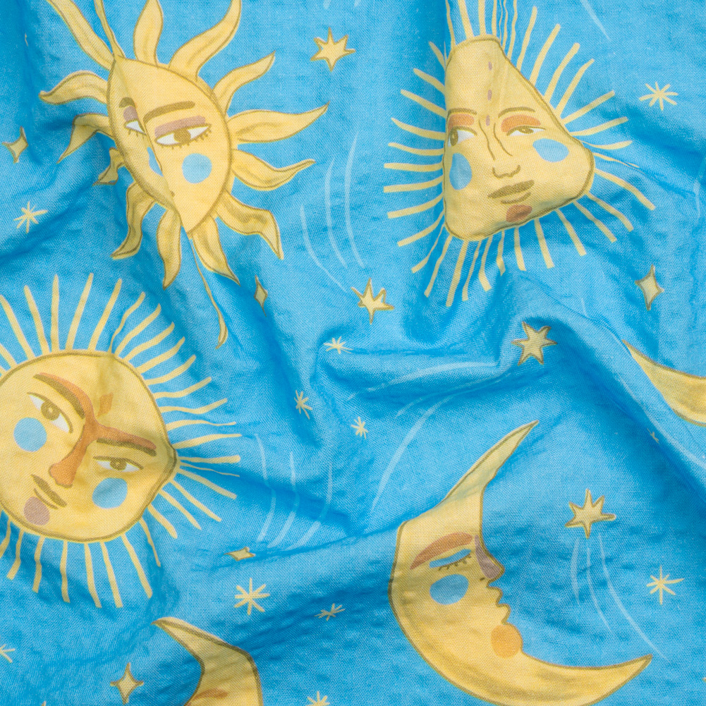 Cotton and Viscose Striped Seersucker Print - Sky Blue Suns and Moons - Mood Exclusive Friendly Faces