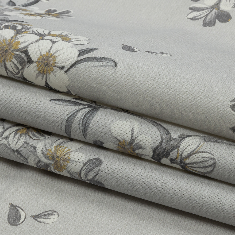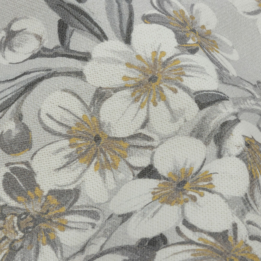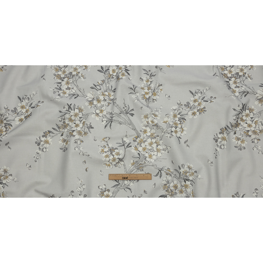 Fall in love with this simple British Imported Dove Blossoming Trees and Bees Printed Cotton Canvas. Painterly trees encrusted in gray and white blossoms are visited by little bees, all atop a pale gray background. With a malleable drape and crisp hand, create curtains for airy living rooms and rustic kitchen looks, plus projects like throw pillows, ottomans, and upholstered headboards. Fashion projects also work well in this canvas—consider a tote bag or bomber jacket! Mostly opaque, insert a drapery lining for full light-blocking where desired.
