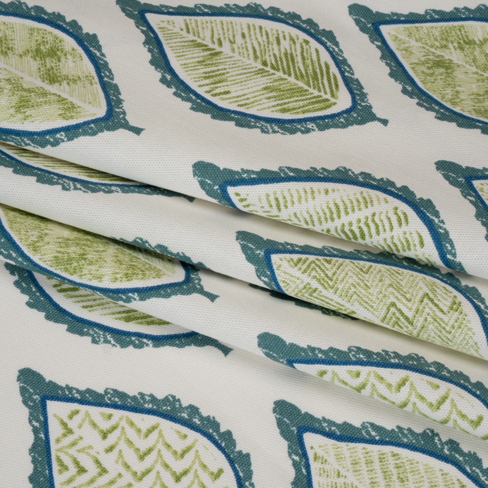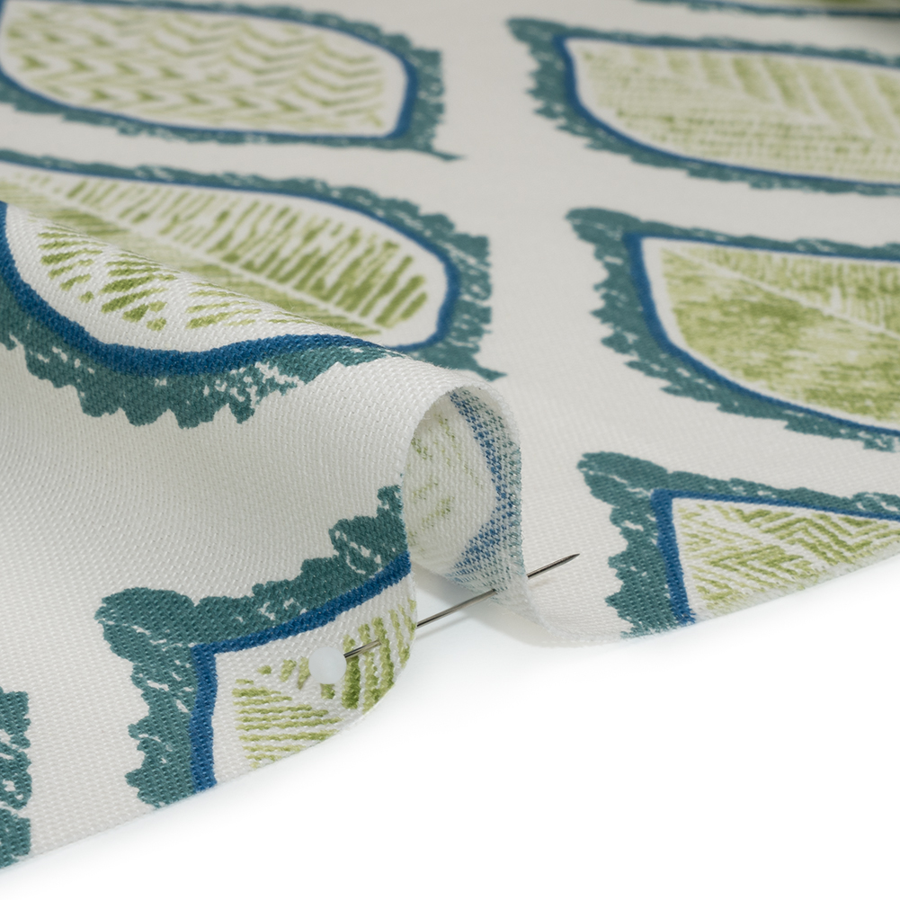 Carefree summers on the lake are evoked with this Lagoon Textured Leaves Cotton Canvas Print. With a crisp hand and structured yet malleable drape, it’s a versatile addition to your interior—or your wardrobe!Suggested Projects: Curtains, Throw Pillows, Tote Bags, JacketsContent: 100% CottonStretch: NoneOpacity: TranslucentFresh green leaves, framed in navy and lagoon blue, line up across an off-white background. With a malleable, structured drape, crisp hand, and no stretch, it's perfect for everything from fun curtains to light upholstery like pillows and wall hangings, and even for some fashion projects, like bomber jackets and tote bags! Translucent, a lining may be used for opacity and structure.