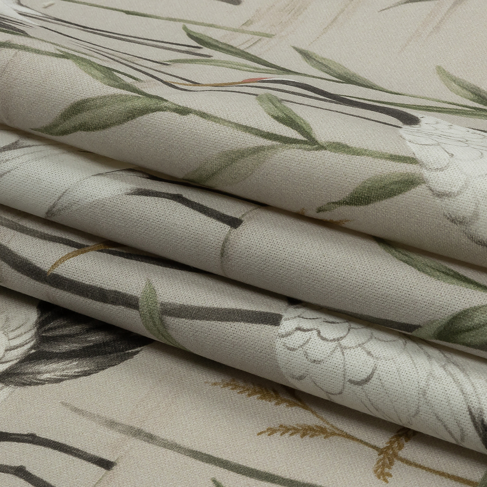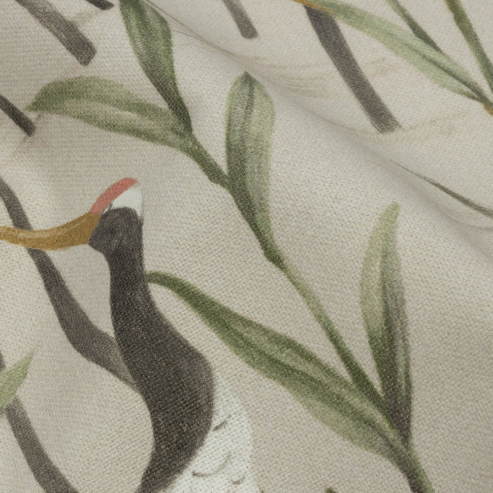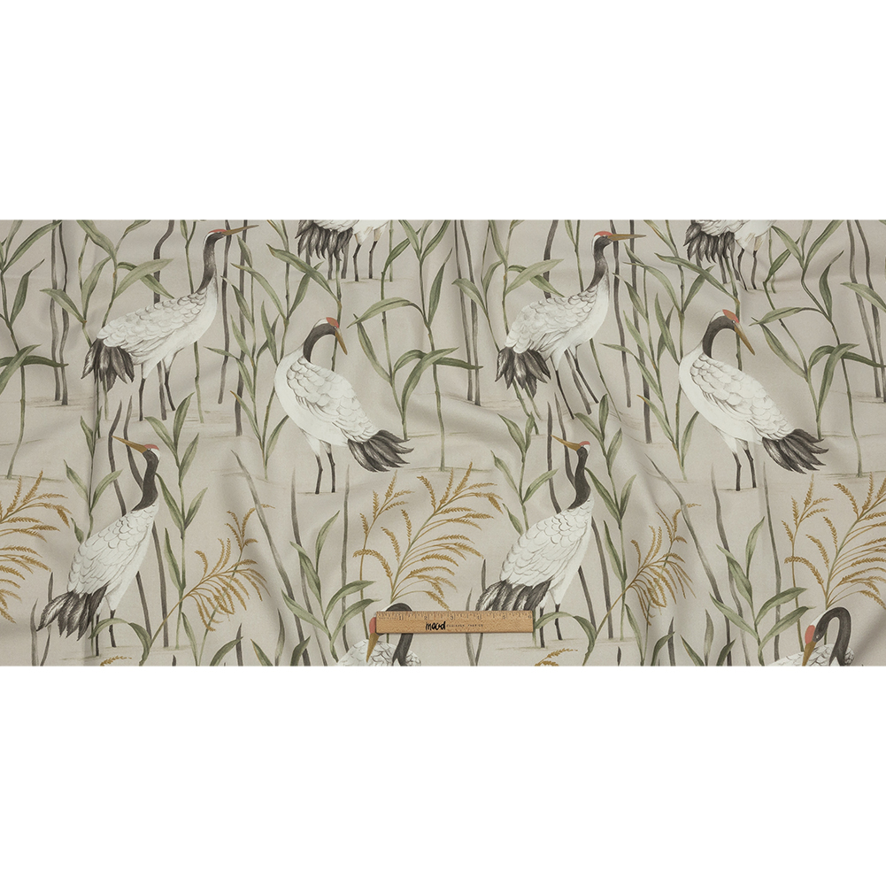 If you are fascinated with birds and all things nature-related then this British Imported Linen Cranes in the Reeds Printed Cotton Canvas is just for you! In a painterly landscape, white cranes with black tail feathers stand in light gray water while green leaves and golden reeds grow all around.