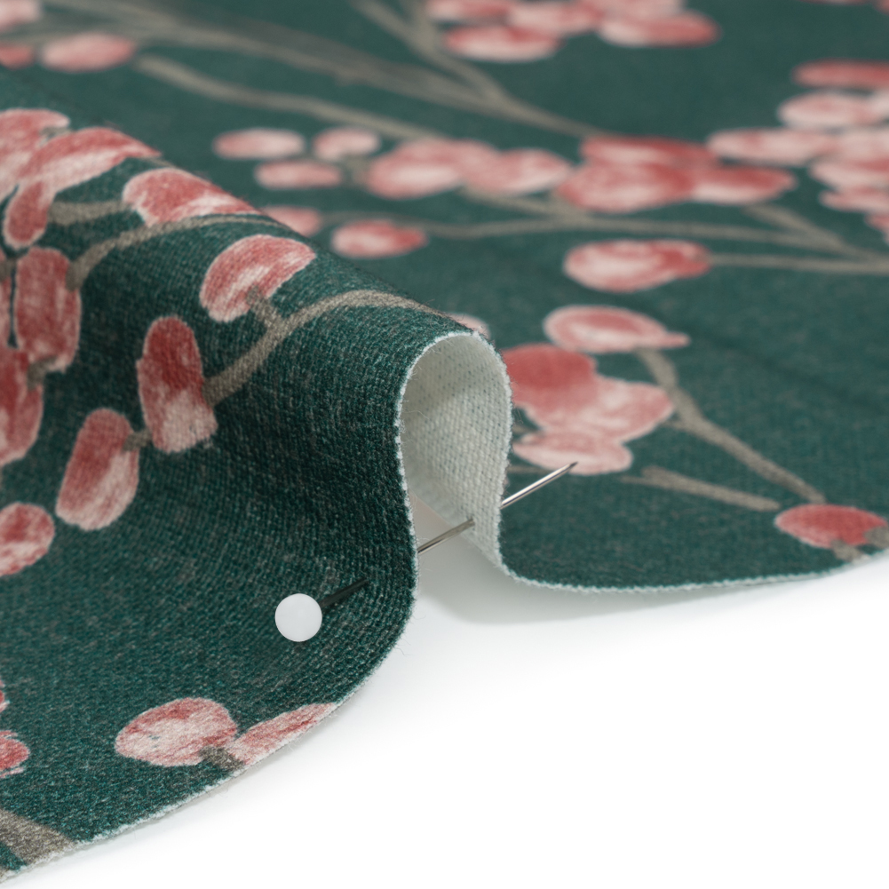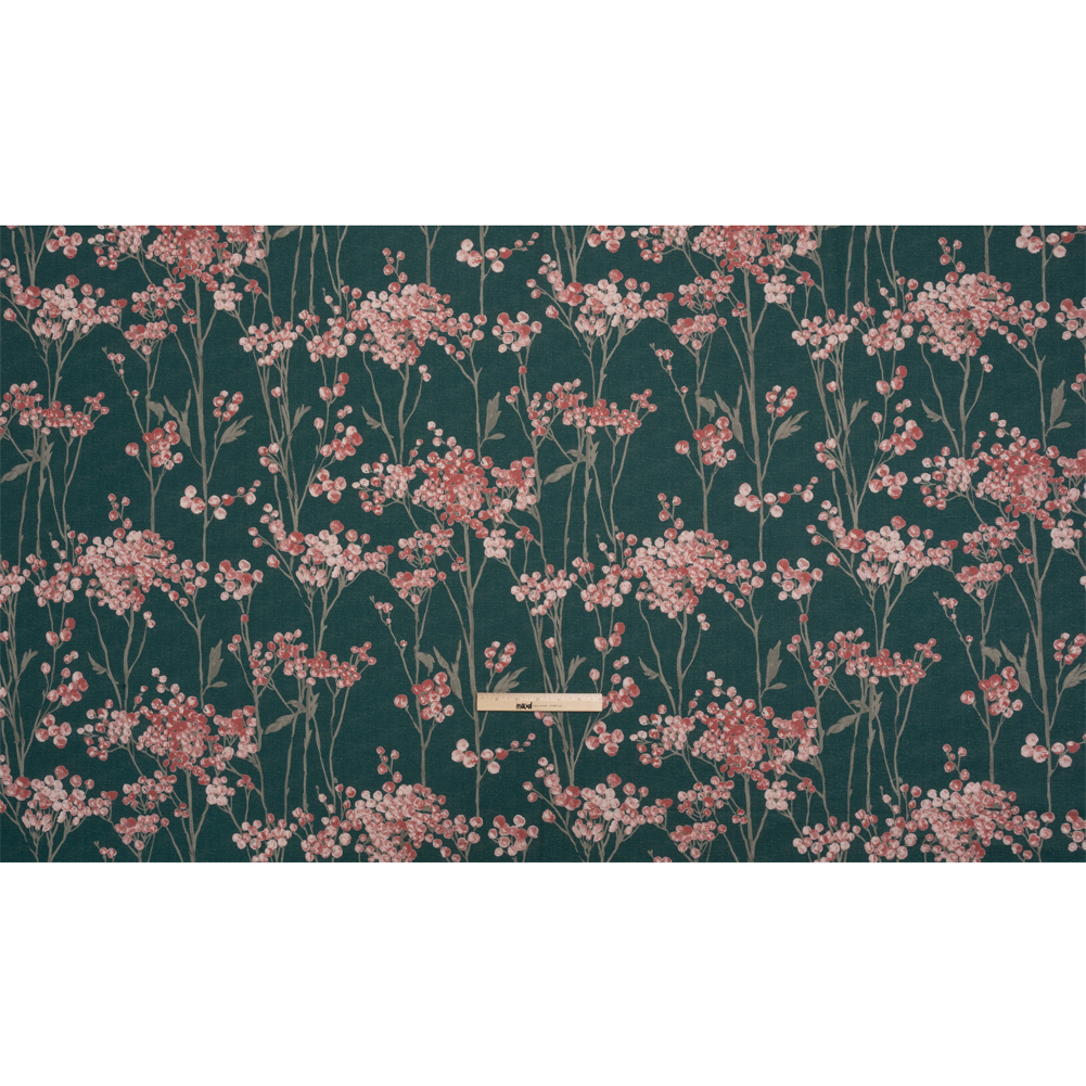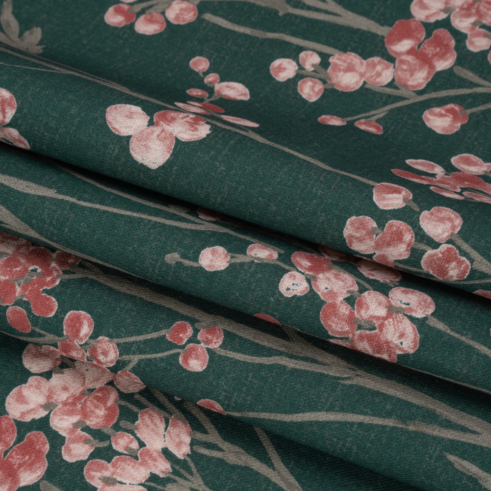 Let interior design ideas bloom from this British Imported Peacock Berry Stems Printed Cotton Canvas! Displaying itself like a piece of art, the dry, flat face paints an image of pink berry trees against a dark, heathered teal sky. The malleable drape, ideal for valances or semi-structured curtains, brings a timeless look into any room. Plus, you can experiment with reupholstery projects like stools and ottomans! As this fabric is slightly translucent, a lining is suggested for total opacity.