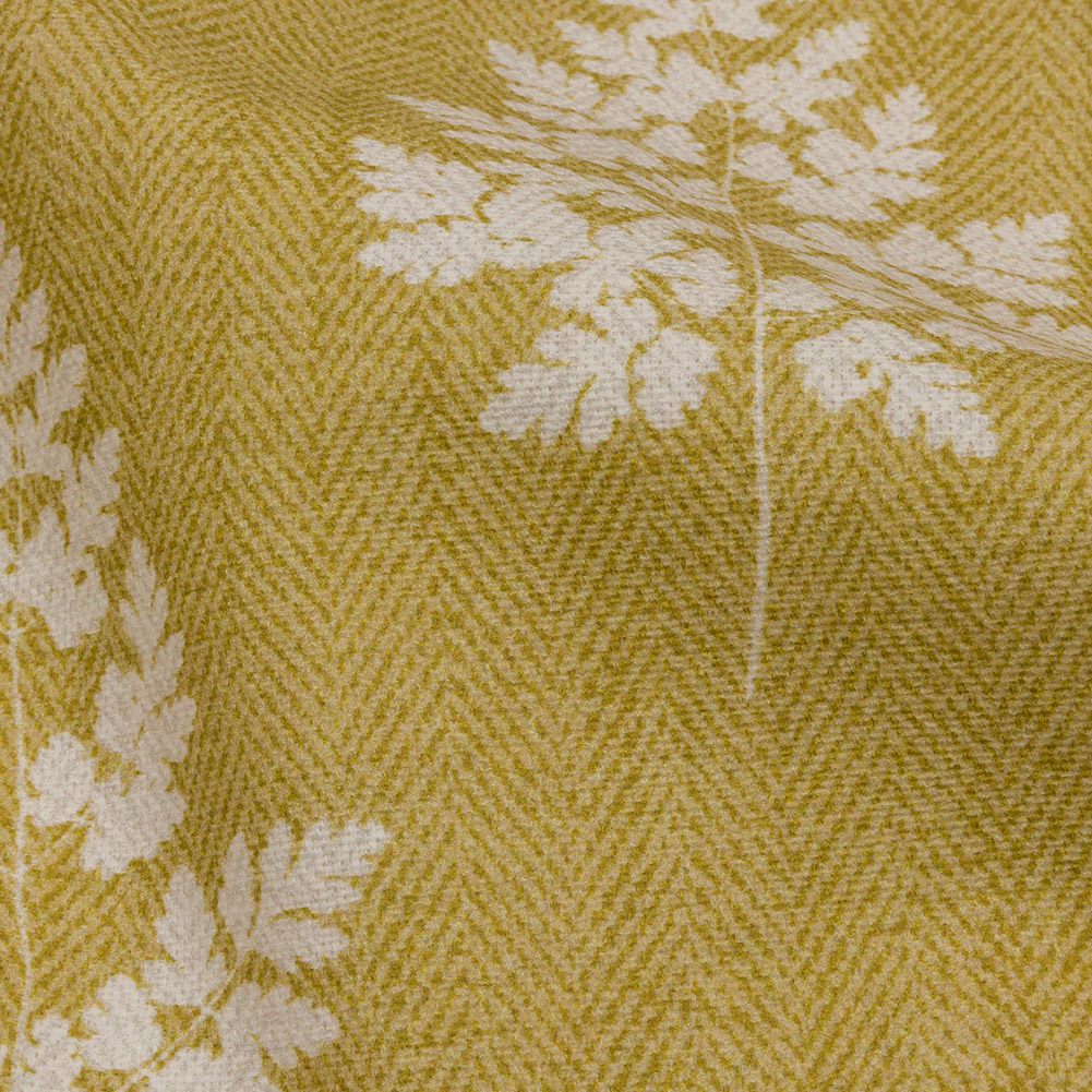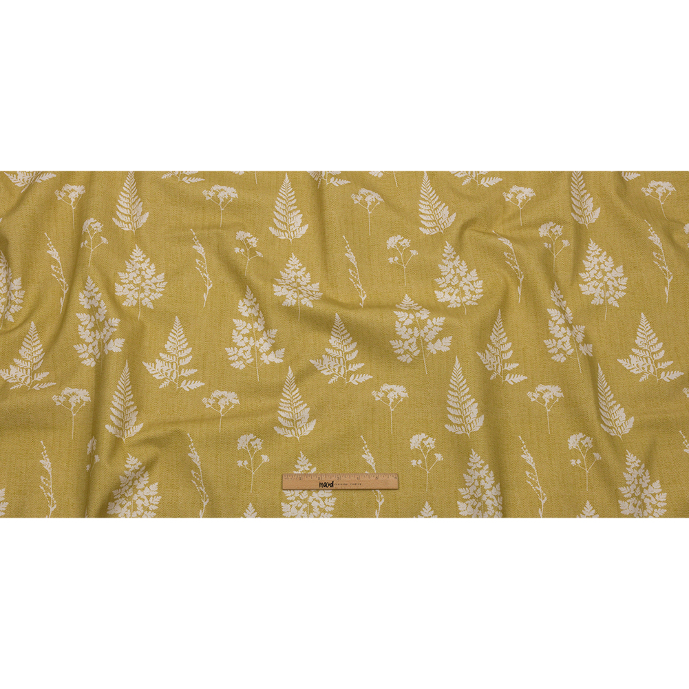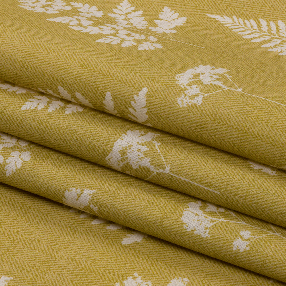 Bursting with botanicals, this British Imported Pollen Botanical Silhouettes Printed Cotton Canvas is a bold and beautiful addition to your home. Evoking the open and airy feel of an estate in the English countryside, this fabric displays a collection of pressed white leaves and flowers against a mustard background. An added feature of a printed herringbone design throughout the face creates the look of texture and dimension, while the backing is plain white. With a crisp hand and a voluminous drape, this 100% cotton canvas falls effortlessly as drapes of any length. Brighten up your rooms with full-length curtains, or upholster sunroom couch cushions. Slightly translucent, a lining may be necessary.