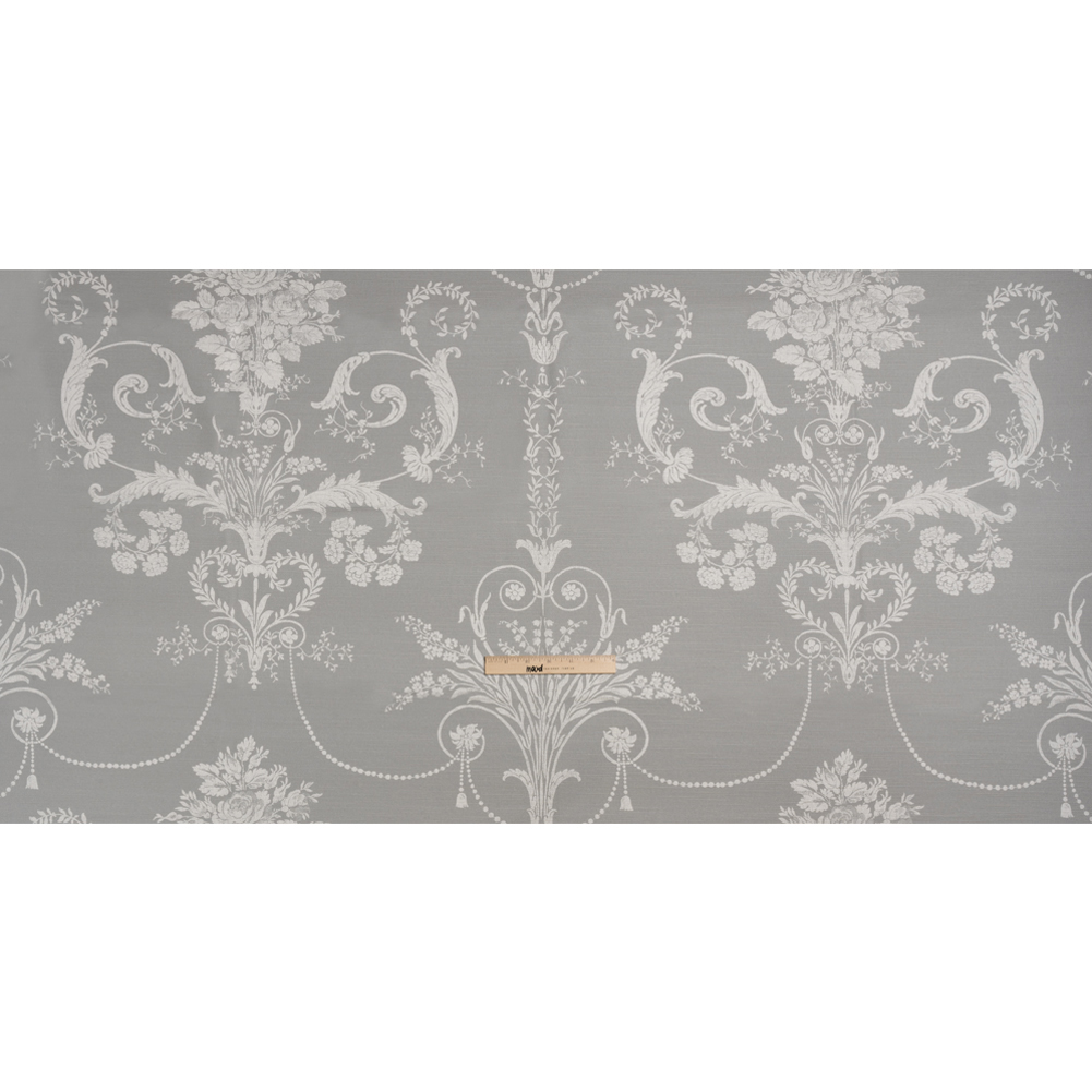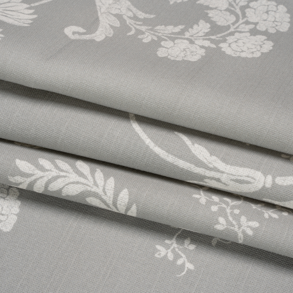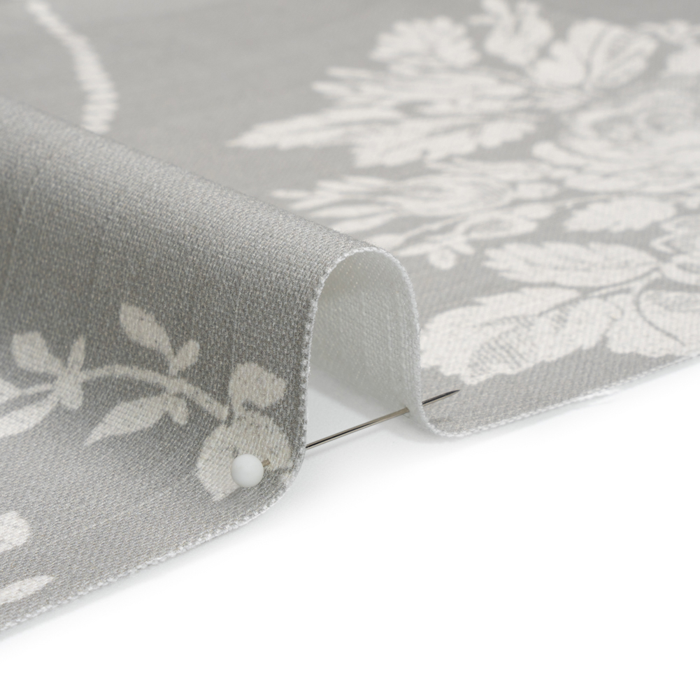 Sprawling arrangements on this British Imported Steel Scrolls and Leaves Printed Cotton Canvas inspire classy designs. White bouquets and floral chandeliers grace this gray fabric with a classical elegance. The pebbly hand, semi-structured drape, and slight transparency create a durable work of art for down-to-earth drapery and light upholstery projects.The natural texture of canvas is rustic in appearance, curating a sense of ease and refinement in your home. This simple pattern charms living spaces with curtains and inspires throw pillows or headboards—plus, in admiration of its stability, even wardrobes can be refreshed with structured jackets and tote bags.