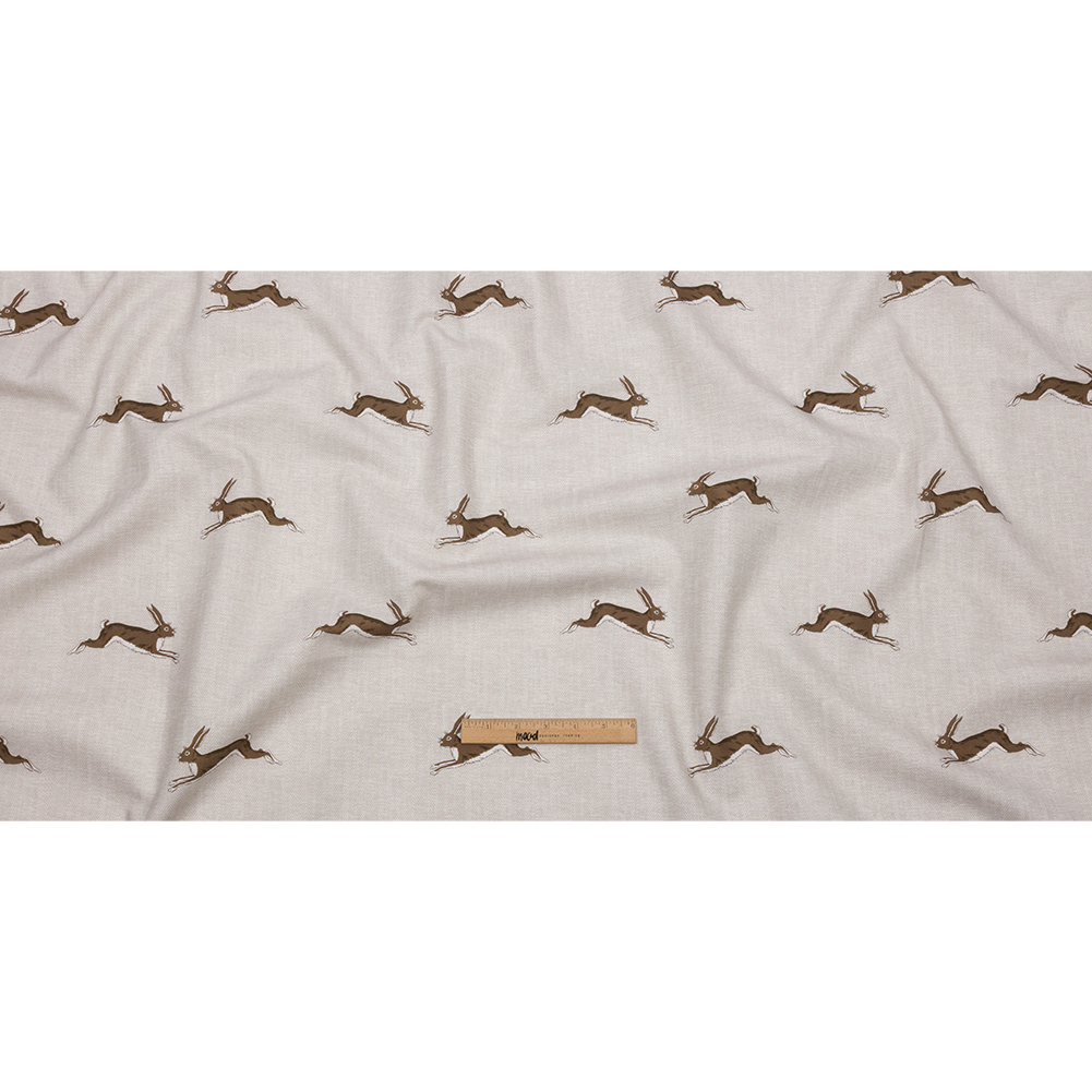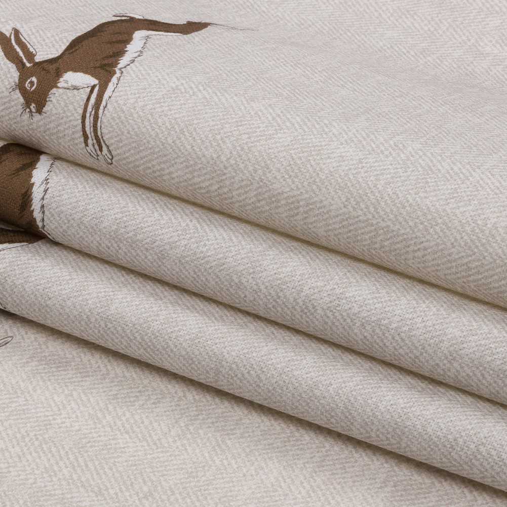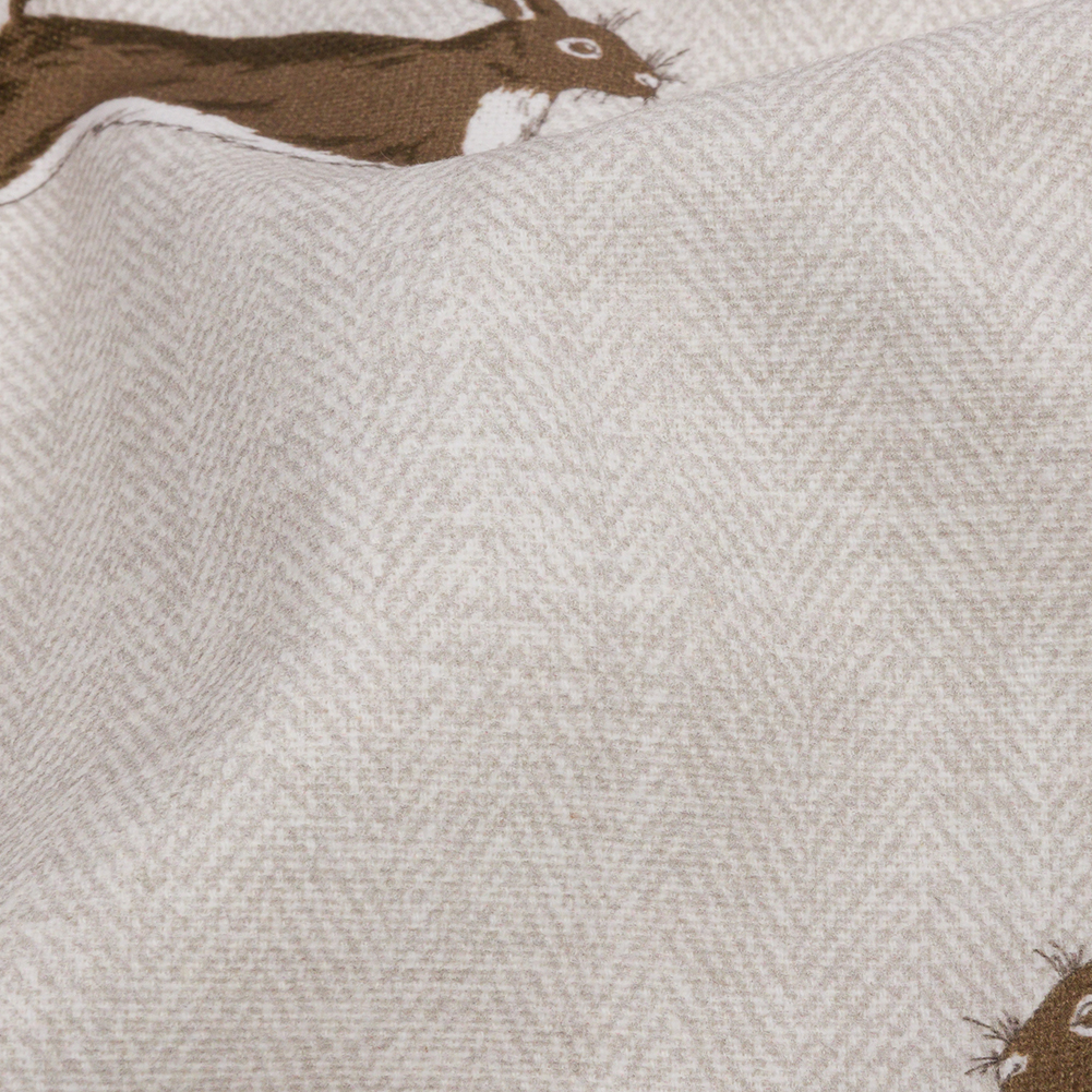 This playfully elegant British Imported Stone Running Hares Printed Cotton Canvas evokes memories of an easy-going life found only deep in the Hundred Acre Woods. Rabbits dart across a 100% cotton fabric featuring a soft yet tactile hand. A beige herringbone print adds visual intrigue to this muted design. With a malleable drape and a light weight, this canvas can be used for a variety of applications such as upholstery, drapery, and home decor. Elevate your cottage-core living room with long drapes, upholster an ottoman in your child’s room, and more! Opaque; a lining is not needed for most projects.