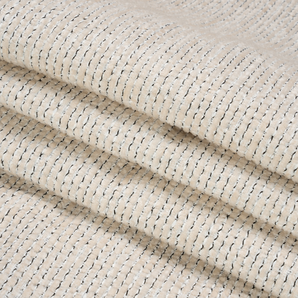 Pepper this Crypton White Pepper Tweedy Stain Resistant Chenille Woven throughout your home decor designs! Black and white threading separates each row of cream chenille yarn to create a simple, tweed-like surface. The hand is plush and slightly pebbly. The subdued face offers an understated charm to relaxed living spaces, while the stain-resistant surface welcomes the chaos of a busy home. Medium in weight and featuring a semi-structured (yet malleable!) drape, reupholster cozy sectionals, loveseats, ottomans, and more!