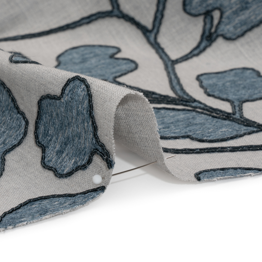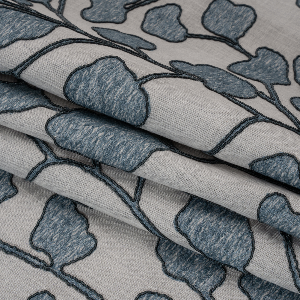 Your creativity will be in full bloom with this Denim Branches Corded and Embroidered Drapery Woven! Embroidered blue branches are budding across a blue-gray woven, outlined by dark teal cording to create a dimensional, visually intriguing face.