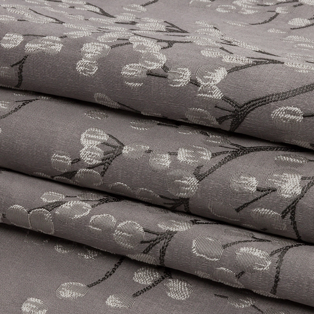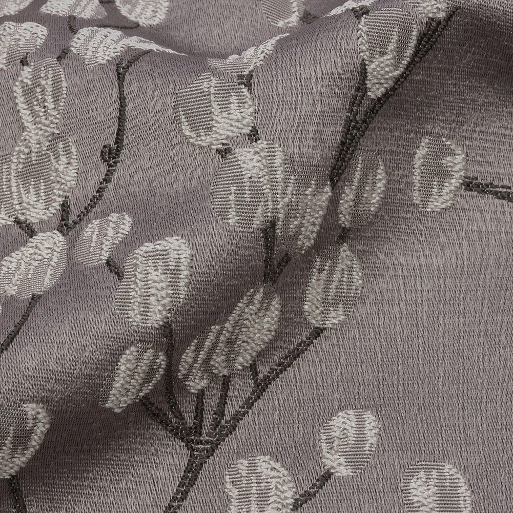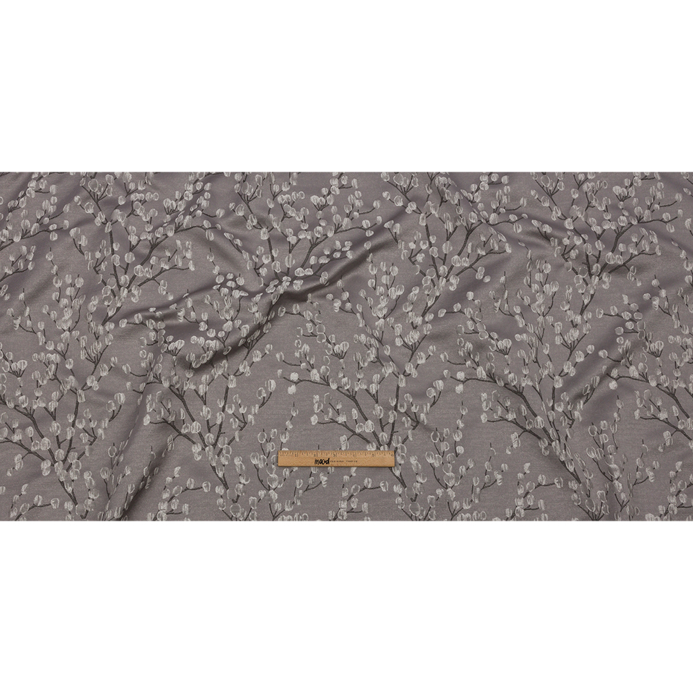 Can you hear this British Imported Dove Prairie Willow Drapery Jacquard chirpping to be a part of your home plans? A gray and silver tree stretches skyward against a luminous, light gray background. Textured by the embroidered-like nature of the Jacquard weave, the hand of this fabric is both elegantly slick and subtly tactile. With a flexible drape and no stretch, create dramatic drapes, long, pooling curtains, and elegant swags. Design light upholstery projects like throw pillows, upholstered headboards, and more. Opaque; a lining can be added to lessen sun damage, but it's not needed for most projects.