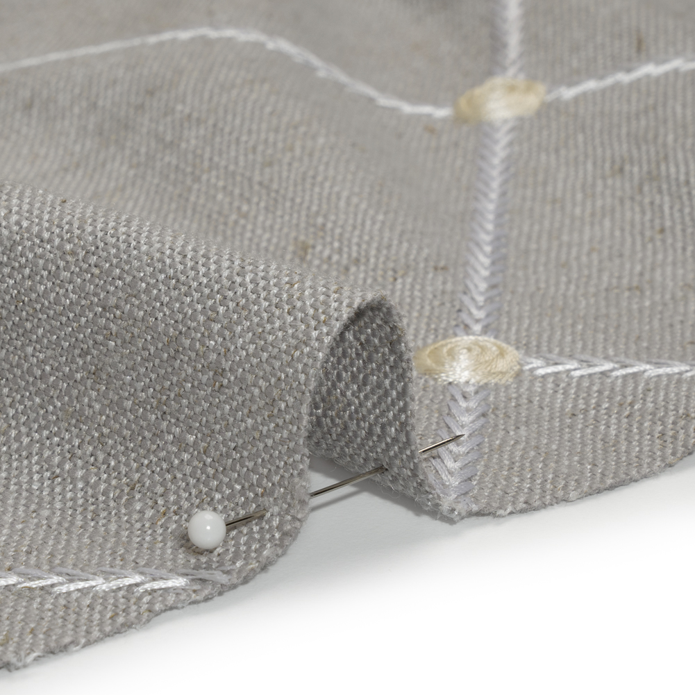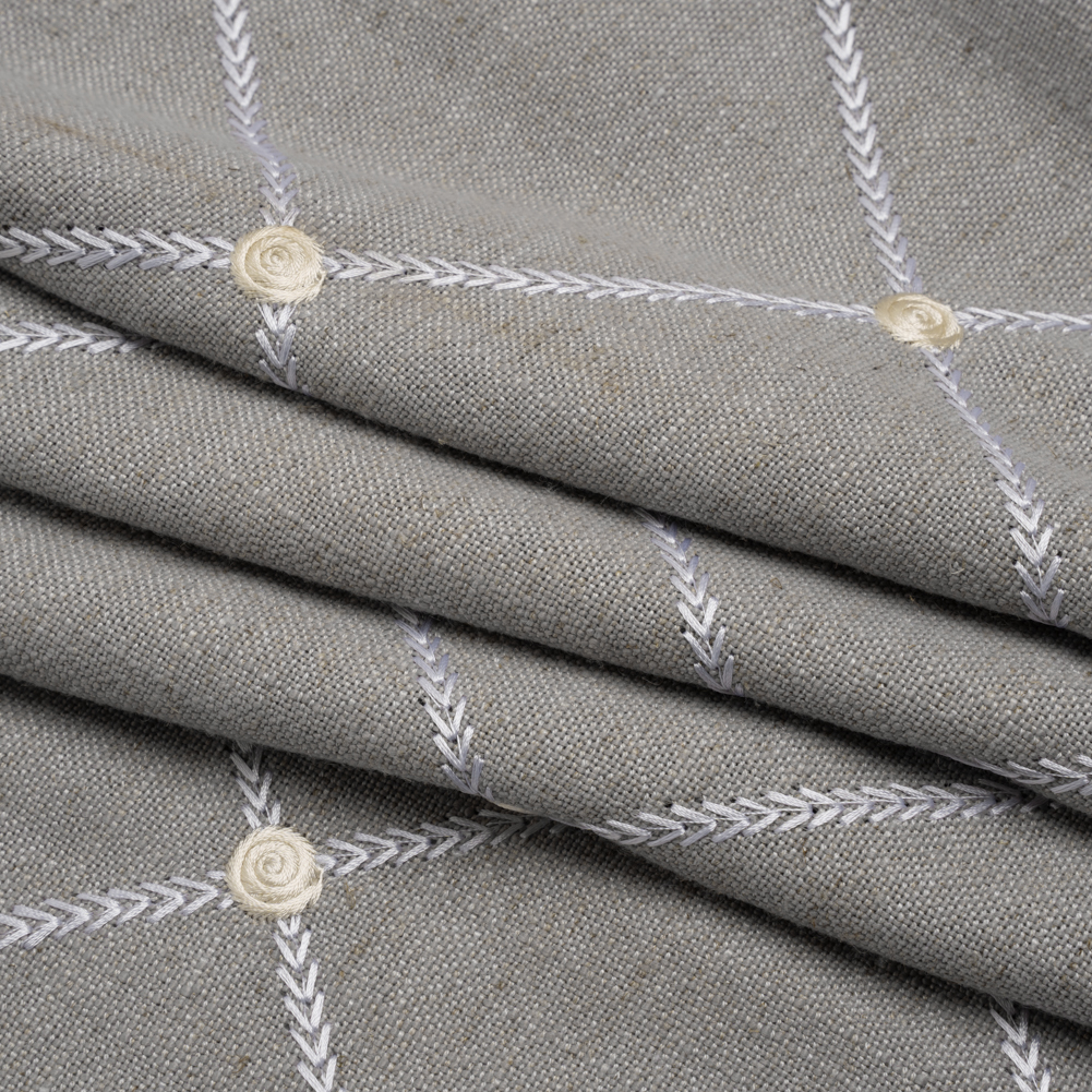 Bring a bit of florals into minimalist designs with this Chinchilla Roses and Diamonds Embroidered Linen Blend Woven. Featuring a malleable drape and tactile hand, perfect for drapery that ripples in the breeze.Suggested Projects: Drapery, Light Upholstery, Throw PillowsContent: 45% Viscose, 35% Polyester, 20% LinenStretch: NoneOpacity: Slightly TranslucentA roses and diamonds pattern is embroidered in ivory upon a warm gray woven. Boasting a visible plain-weave structure, this chinchilla gray and ivory woven with slight variations in hue and flecks of brown promises a soft, tactile hand with a slubbed texture typical of linen, as well as a malleable drape. Ideal for all your home decor needs, fashion pleated drapes and curtains, or create eye-catching throw pillows! Due to its slightly open weave, this medium-weight fabric allows some light through, so consider adding a lining for complete opacity or additional structure. Please note that the embroidery only spans 50 inches of the total 56-inch width.
