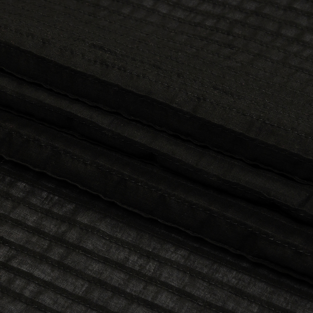 Show your edgy side with this Famous Australian Designer Black Pintucked Cotton Lawn! The black material features narrow pin tucks running along its length. Voluminous and billowy in drape, it offers a crisp, textured hand and slight weftwise mechanical give, though it should be treated as a non-stretch fabric while sewing. Create bell-sleeved blouses, cold shoulder tops, and circular dresses or skirts! Translucent, consider adding a lining where opacity is desired.