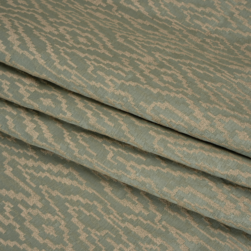 Earth tones, recycled fibers, and a sleek but textural feel ensure this Eucalyptus Geometric Drapery Jacquard is not a fabric to be missed, no matter your drapery goals!Suggested Projects: Curtains, Valances, Drapes, ShadesContent: 65% Recycled Polyester, 28% Cotton, 7% PolyesterStretch: NoneOpacity: Mostly OpaqueTurn your house into an oasis with this fabric! A beige geometric pattern rises from the lustrous seafoam background, bringing depth to the face with its embroidered-like hand and subtle appearance of shadows.
