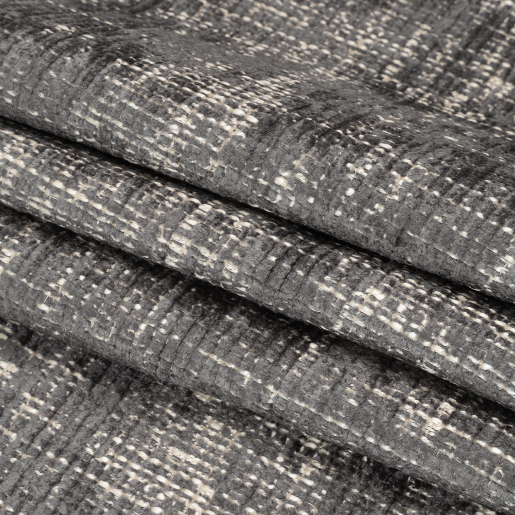 Become the comfiest home on the block with this Graphite Distressed Look Chenille Upholstery Woven! The plush, dark gray chenille yarn is smooth and lustrous, woven with beige and white yarns that bring a distressed look to the face, along with a pebbly dimension to the hand.