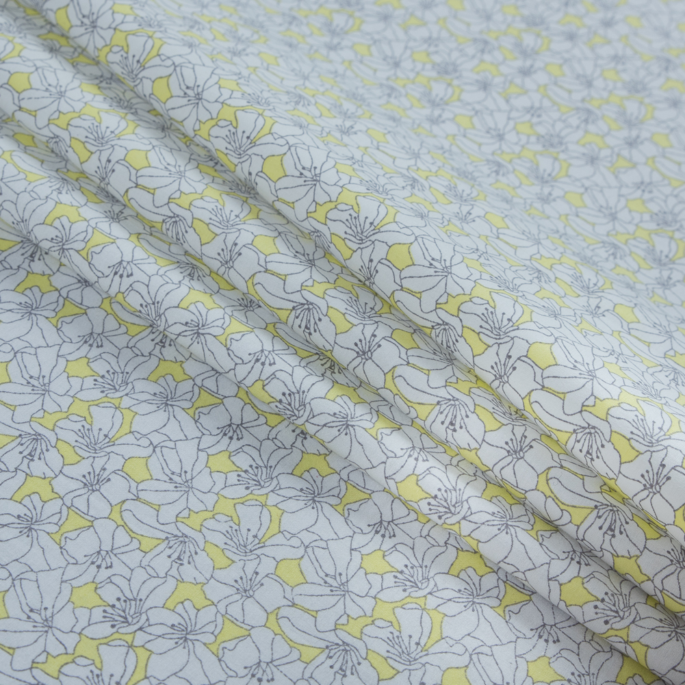 In bloom with refreshing style, take home this Floral Printed Cotton Poplin. Hand-drawn lilies bloom over this crisp poplin creating a contemporary look. Thin and lightweight, make breathable oxford shirts, shirt dresses, or even flared skirts. Its drape is mostly stiff, but it hangs well off of the body. Slightly translucent, a lining may be desired.