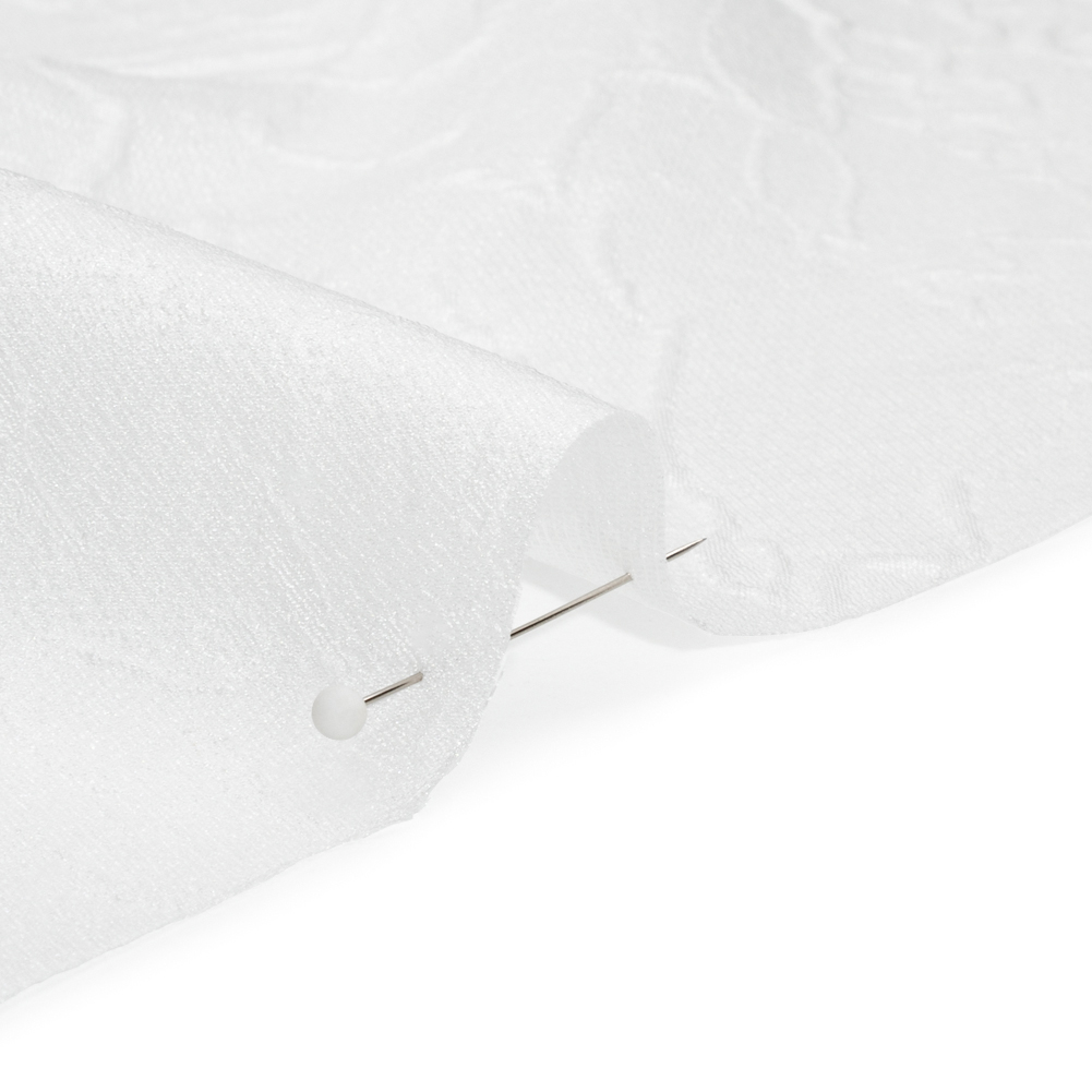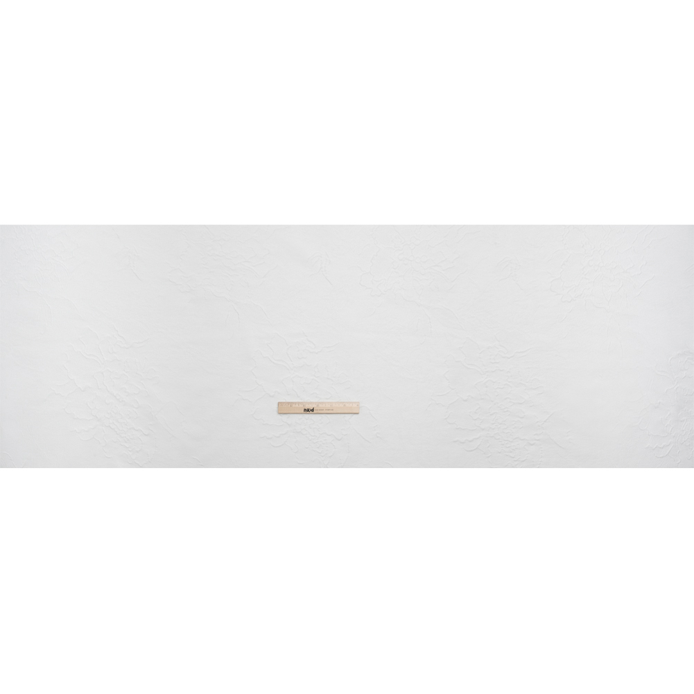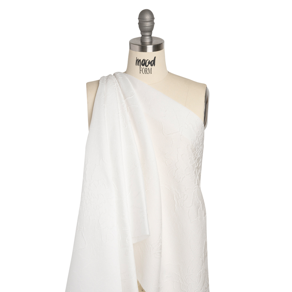 Pour a glass of champagne to celebrate this Luminous Off White Crinkled Luxury Brocade! Achieved by additional weft threads in the weave, stiff wrinkles form abstract flowers on the lustrous off-white face, creating a three-dimensional surface teeming with texture. The hand is grainy and tactile; the drape is semi-structured and voluminous. This opulent fabric encourages special occasion gowns, structured jackets, corsets, and more. As it is translucent, a silk habotai lining will increase comfort, opacity, and luxury.