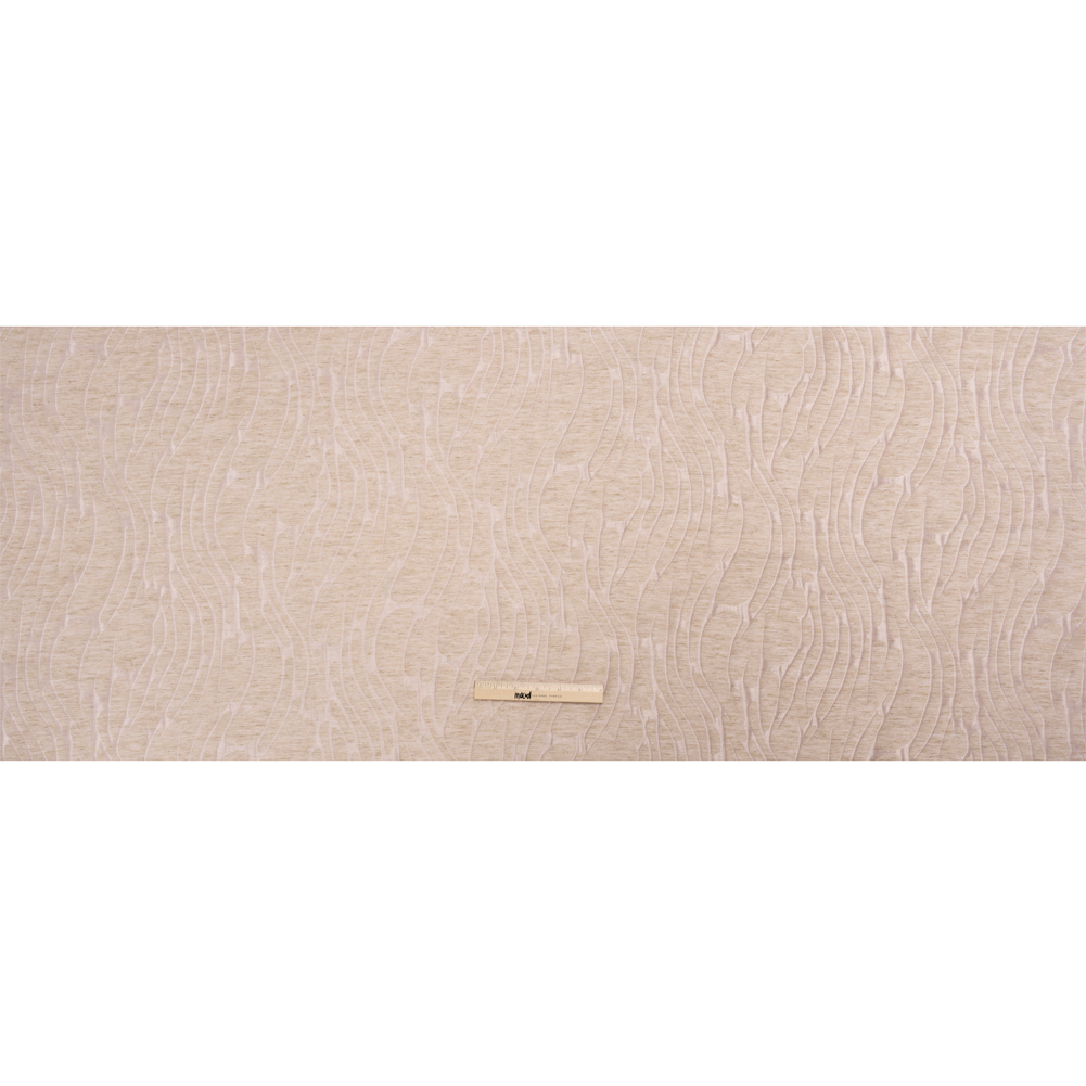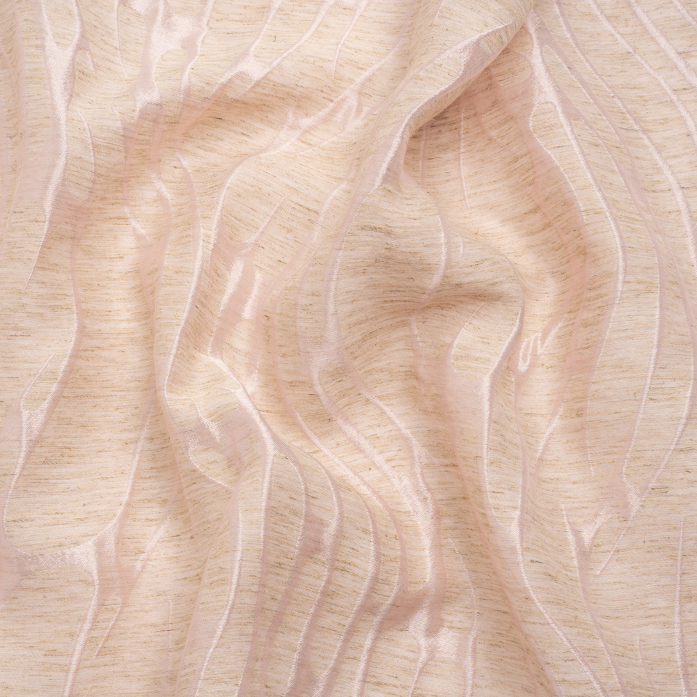 Feel graceful in this Luminous Pink and Heathered Beige Ripples Lightweight Polyester and Linen Brocade. Wild pale pink rapids course through a heathered beige river, shining with a metallic luster. The ripples slightly protrude from the face, bringing dimension to the crisp and grainy hand. Consisting of a linen and polyester blend, this elegant brocade features a lightweight and malleable drape. Enjoy dinners in structured jackets, weddings in perfectly tailored gowns, evenings in sheath skirts, and more! Plus, it's perfect for home decor applications like elegant curtains, light upholstery, and more! Please note that this fabric is highly transparent; a silk habotai lining is recommended to increase opacity and luxury!