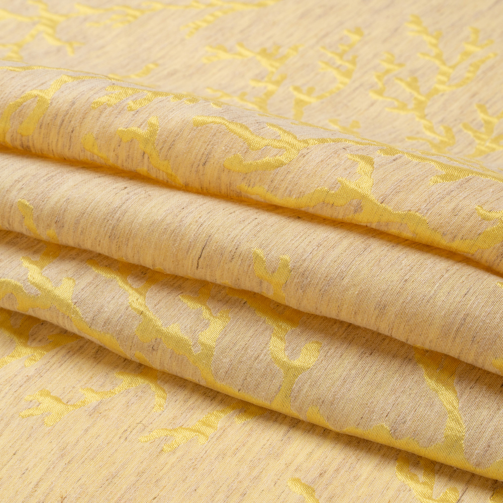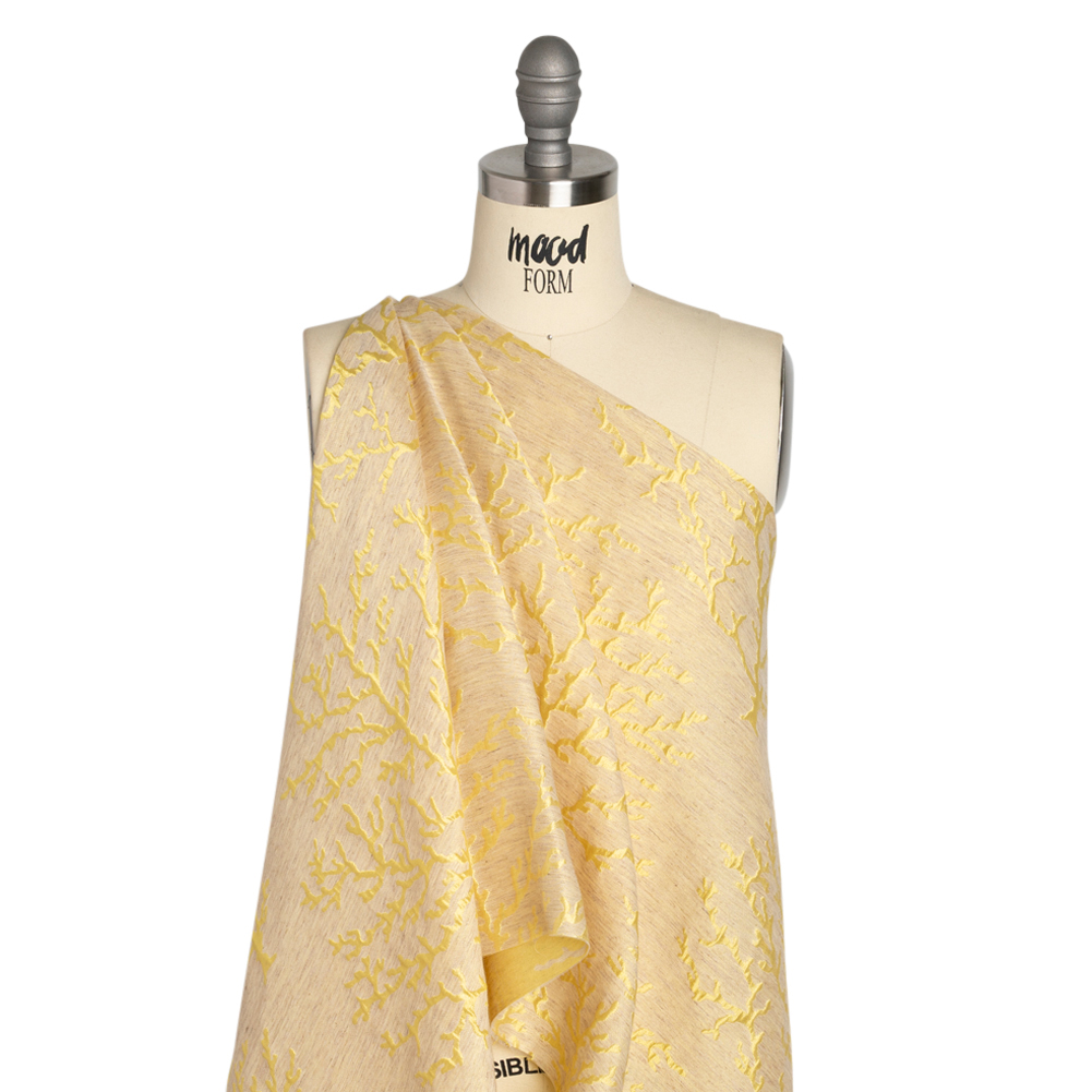 The mid-day sun bounces its bright rays off of this Luminous Yellow and Heathered Beige Winter Trees Lightweight Polyester and Linen Brocade! Shining with a frosty luster, yellow trees stretch their barren branches into a heathered beige background. Consisting of a linen and polyester blend, this lightweight brocade features a crisp, grainy hand and a malleable drape. Enjoy dinners in structured jackets, weddings in perfectly tailored gowns, evenings in sheath skirts, and more! Plus, it's perfect for home decor applications like elegant curtains, light upholstery, and more! Please note that this fabric is highly transparent; a silk habotai lining is recommended to increase opacity and luxury!
