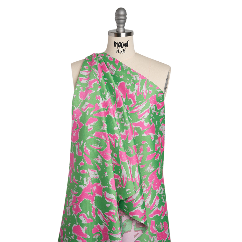Take inspiration from rich green fields ripe with wildflowers when using this Sparkling Hot Pink and Kelly Green Abstract Markmaking Luxury Polyester Brocade—featuring a soft, smooth hand and voluminous drape.