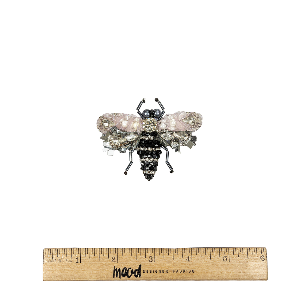 Elevate your next project with this Mary's Rose, Gunmetal and Black Fly Rhinestone, Sequins and Glass Beaded Appliqué! Measuring 2.25 inches by 2.875 inches overall, this fly-shaped appliqué is composed of black and gunmetal glass beads as well as crystal rhinestones, with wings decorated in translucent pink round sequins and mirror-like silver rectangular sequins.Individually hand-beaded, these appliqués are truly one-of-a-kind, perfect for adding a couture touch to every garment you make. Dress up a denim jacket or hat, decorate the lapels of a shirt or blazer, or apply a glittering accent to gowns and special occasion dresses—every appliqué is crawling with possibilities.Please Note: These couture appliqués arrive in a sealed package adhered to a paper backing card; when removing, it is possible that a bead of glue may remain on the reverse. The glue is best removed with an X-Acto or utility knife. Keeping the blade parallel to the back of the appliqué, simply cut the adhesive bead off; if any residual glue or paper remains, lightly scrape the blade back and forth over the area. A fresh blade is recommended. Always point the blade away from your body and hands while cutting or scraping.