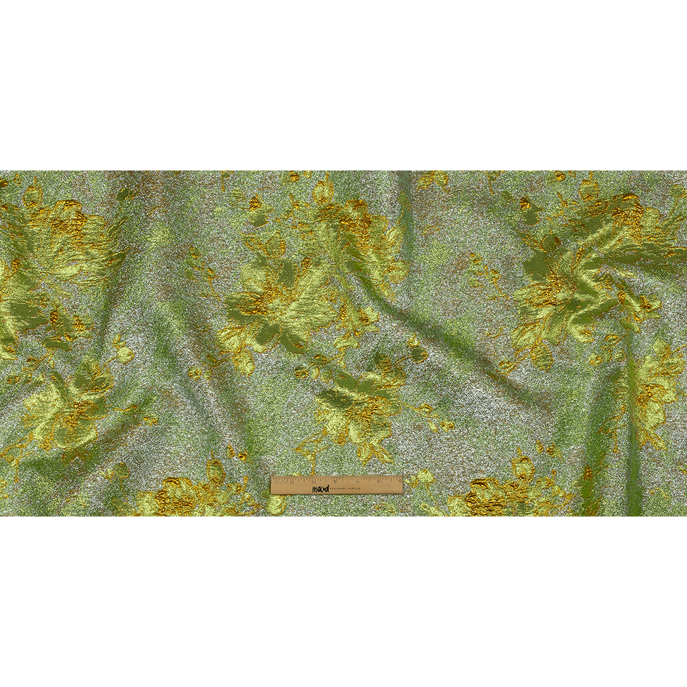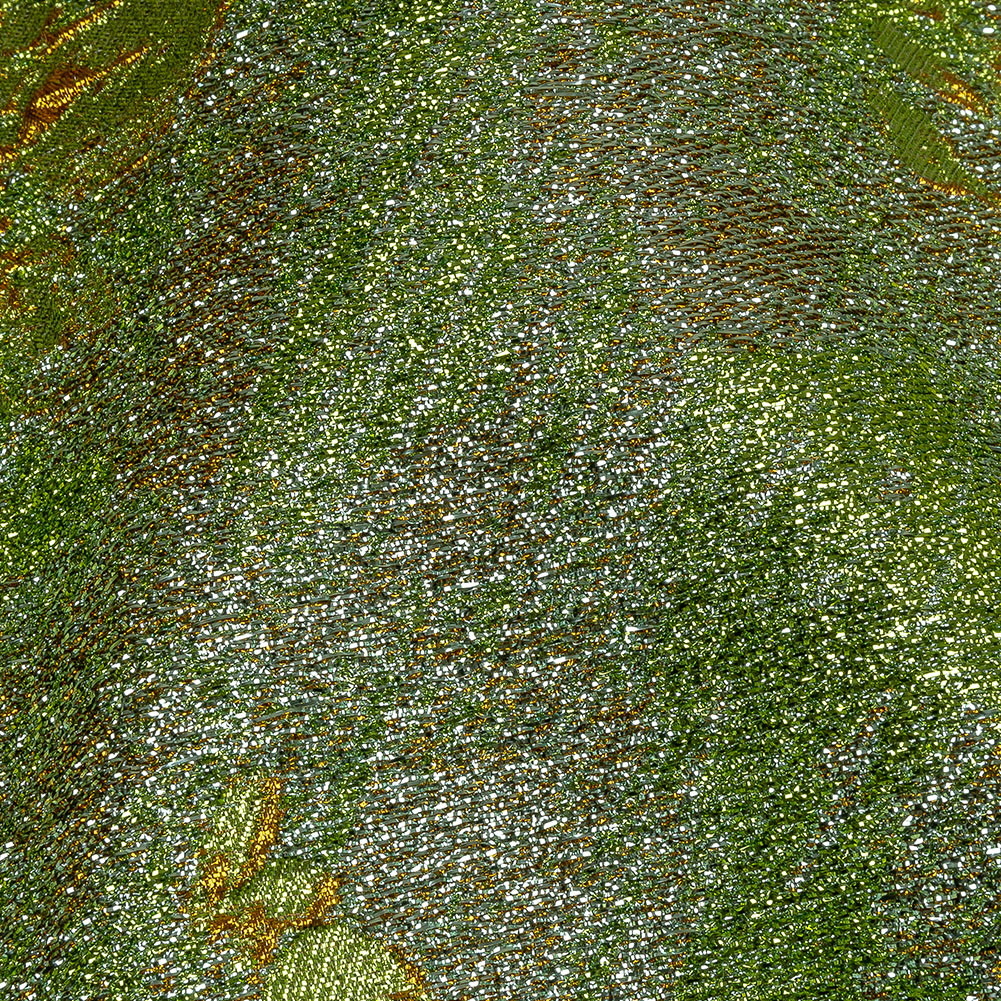 We are proud to announce our Caribbean-inspired Metallic Aqua, Lime and Solar Flare Crackled Floral Luxury Brocade. This elaborate brocade features an upbeat lime green and barely-aqua background with rich orange-gold floral outlines raised in the foreground. Crisp in hand, this brocade drapes in a flexible, though voluminous fashion with no stretch. We invite you to create couture gowns, flared party skirts, or stylish suit jackets! Due to its coarse texture, a lining is kindly recommended for additional comfort. Practice taking gentle care with the fabric since the delicate metallic threads are somewhat prone to unraveling.