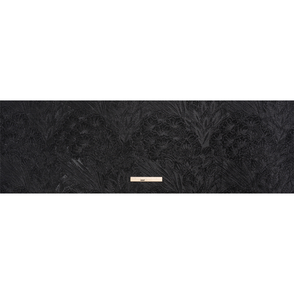Although nightfall cloaks the royal garden in darkness, this Metallic Black Gleaming Garden Luxury Brocade still manages to shine. Feathers, fans, leaves, and flowers grow in bushels against a black background. Their outlines are raised, creating a dimensional face and a tactile texture. Run your hand across the surface to feel the sandpapery metallic threading and the spongy, embossed garden. Create voluminous gowns and spellbinding circle skirts with the malleable drape, or fashion structured jackets, bodices, and more. As this fabric is slightly translucent, a silk habotai lining is recommended to increase opacity, comfort, and luxury!