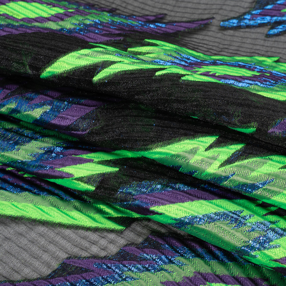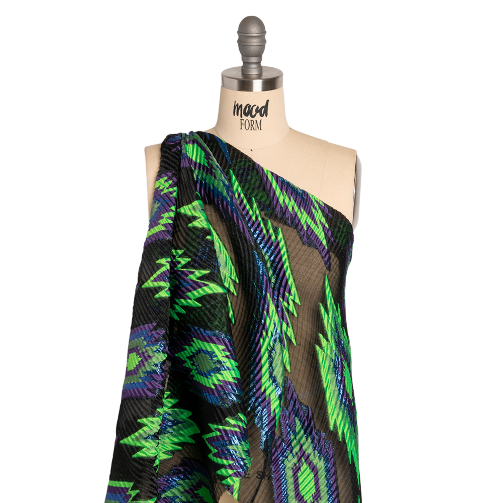 Electrify your next evening out with this Metallic Blue, Purple and Lime Exploding Stars Ribbed Luxury Burnout Brocade! A chemical treatment makes the majority of the face sheer, leaving behind oblong neon green, purple, and metallic blue geometric shapes to float against a black background.