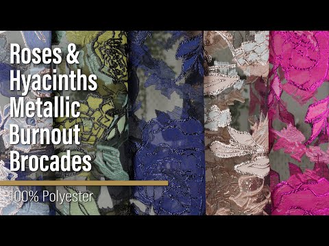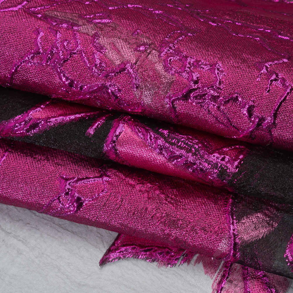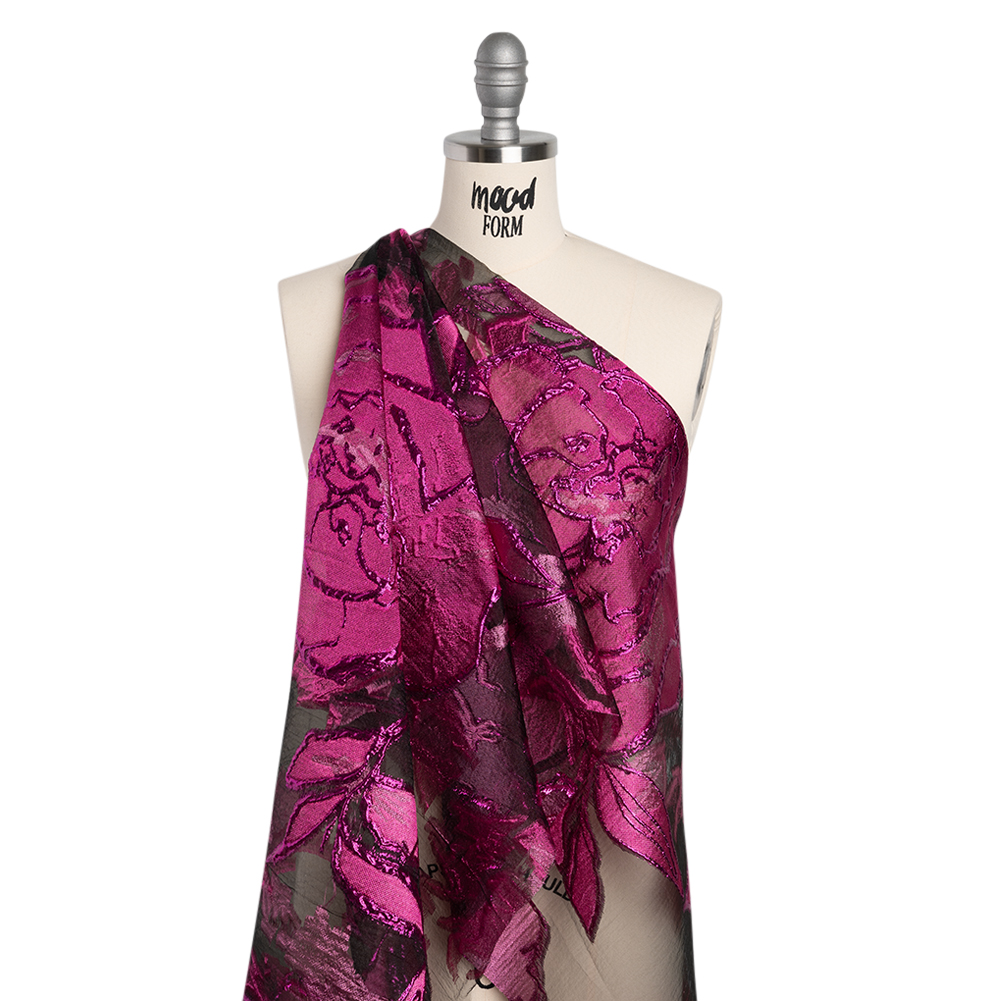 Achieve that perfect pink look with this Hot Pink, Black and Magenta Roses and Hyacinths Metallic Burnout Brocade. With a tactile hand and slightly structured drape, it’s the ideal choice for eveningwear overlays.Suggested Projects: Overlays for Gowns, Skirts, JacketsContent: 100% PolyesterStretch: NoneOpacity: SheerHot pink and magenta roses and hyacinths bloom across a sheer black background, their petals and leaves outlined starkly in metallic magenta. The metallic magenta outlines and lustrous florals grab the eye and naturally emphasize and contrast the sheer nature of the burnout. With a soft, tactile hand and slightly structured drape, this burnout brocade is perfect as an elegant overlay for a gown, skirt, and even suit jackets! Most of the brocade is sheer, so we suggest adding an equally luxurious lining if you’re looking to preserve modesty.