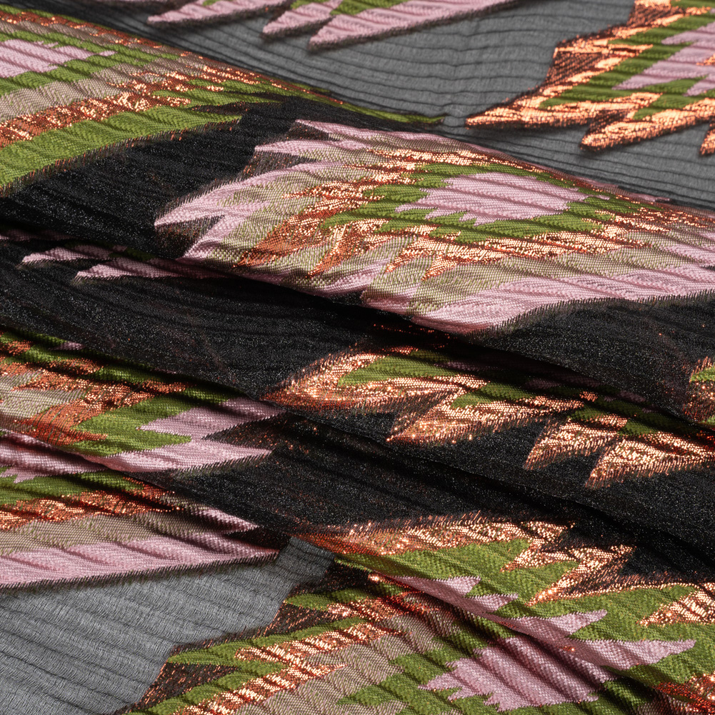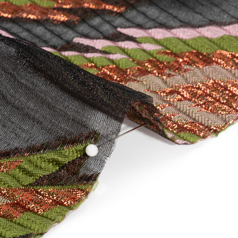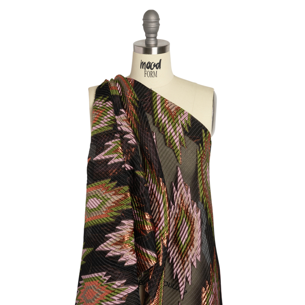 Let your personality explode with this Metallic Copper, Mauve and Olive Exploding Stars Ribbed Luxury Burnout Brocade! A chemical treatment makes the majority of the face sheer, leaving behind oblong green, mauve, and metallic bronze geometric shapes to float against a black background. This fun and spunky fabric has a luxurious feel, featuring a ribbed face and a sleek yet tactile hand. This dimensional face, created by additional weft threads in the weave, is what separates brocades from other fabrics. Semi-structured yet voluminous, the drape lends itself wonderfully to stunning ball gowns and wide-circle skirts. You may also find yourself dreaming up sheath dresses, structured jackets, and more! For extra luxury, we suggest lining this fabric with our silk habotai.