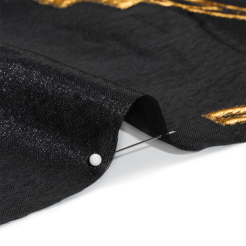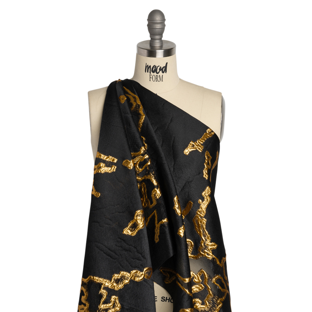 Set fire to your wardrobe with this Metallic Gold and Black Abstract Embers Luxury Burnout Brocade! Molten metallic ridges spread like embers over a semi-sheer black background, giving way to sheer areas between the gold. The hand is sleek and dimensional, thanks to the brocade weave, and the drape is semi-structured. Create voluminous ballgowns, structured jackets, overlays for skirts, and more! A silk habotai lining may be desired to achieve full opacity.