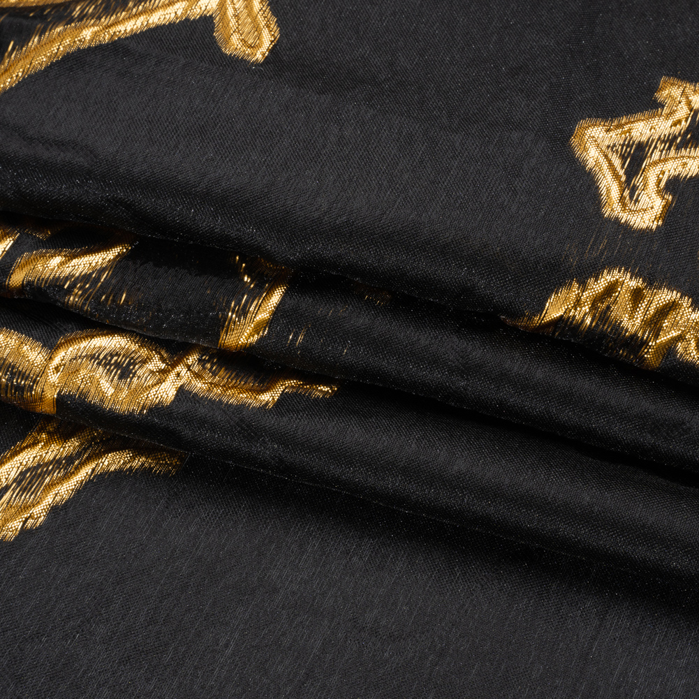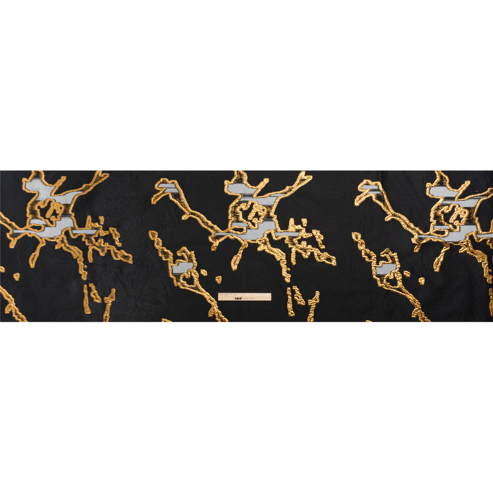 Set fire to your wardrobe with this Metallic Gold and Black Abstract Embers Luxury Burnout Brocade! Molten metallic ridges spread like embers over a semi-sheer black background, giving way to sheer areas between the gold.