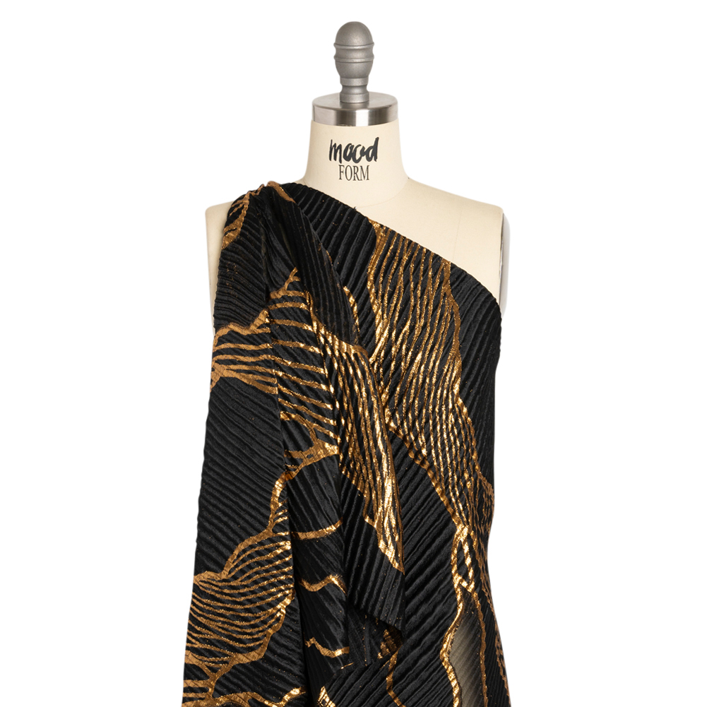 The stunning contrast of this Metallic Gold and Black Abstract Formations Ribbed Burnout Luxury Brocade is undeniably rich. A black sky parts to display sheer black sections as striped metallic clouds stretch across the face. The intricate weave creates a heavily ribbed texture, bringing dimension to the slick hand. With its semi-structured (yet voluminous!) drape, wonderful luster, and detailed face, this brocade evokes a sense of luxury. For profound garments and special-occasion formal wear, create bold gowns, unique circle skirts, exciting corsets, structured jackets, and more. Plus, you can increase comfort and luxury with the addition of a silk habotai lining!
