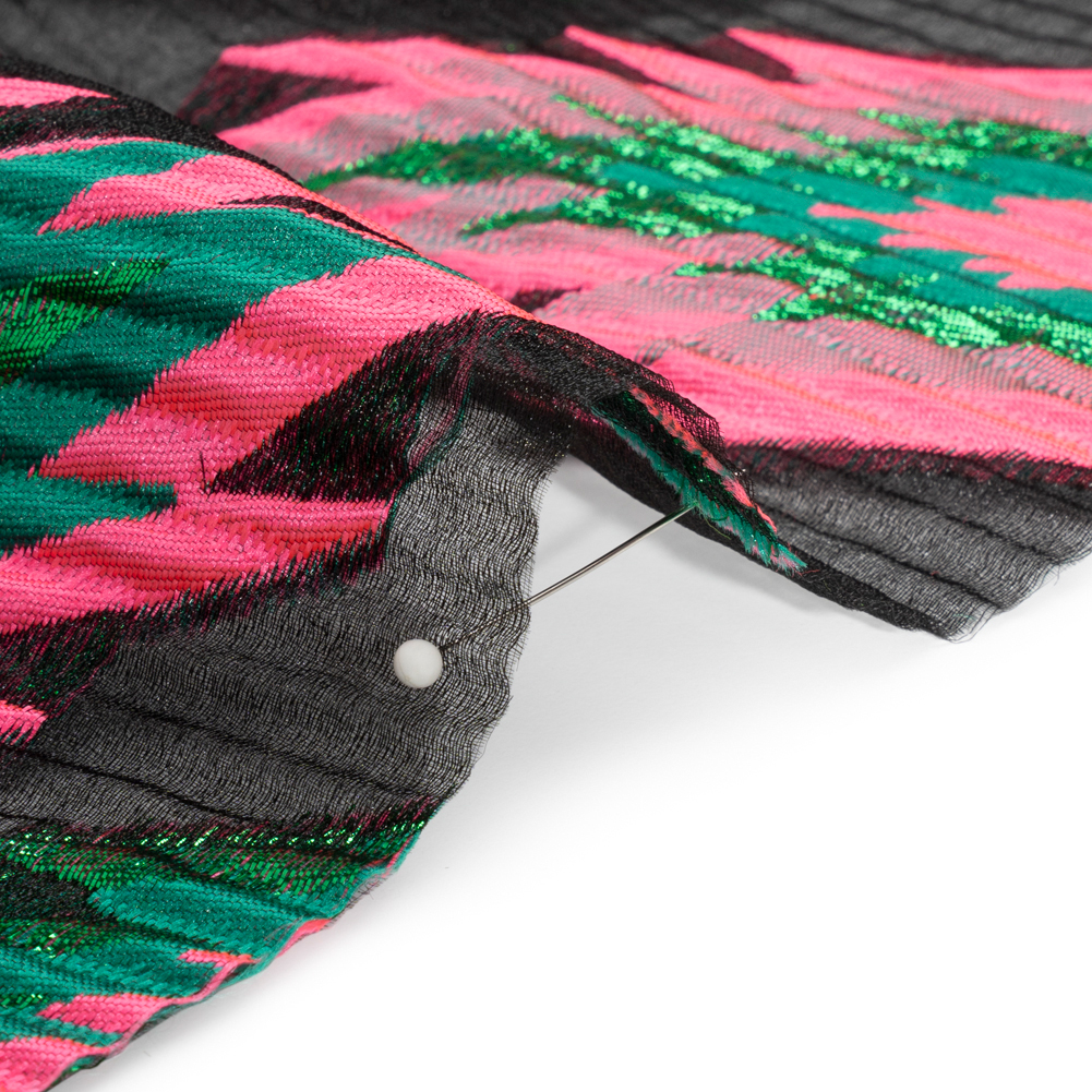 Bring an explosion of color and luxury into your wardrobe with this Metallic Green, Hot Pink and Black Exploding Stars Ribbed Luxury Burnout Brocade! A chemical treatment makes the majority of the face sheer, leaving behind oblong hot pink, emerald, and metallic green geometric shapes to float against a black background.