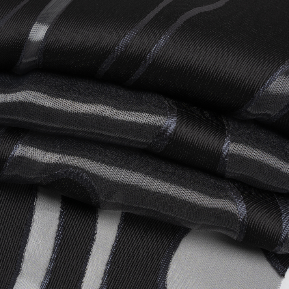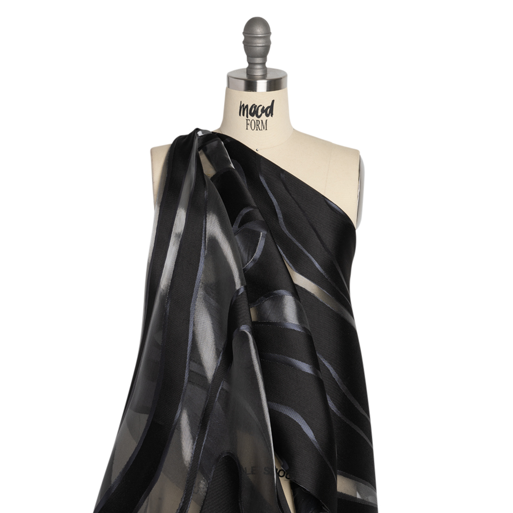 Flood your wardrobe with the elegance of this Metallic Gunmetal and Black Flowing Lines Luxury Burnout Brocade. Metallic black ripples flow through woven sections that yield a soft hand. As sheer streaks add more fluidity to the face, you begin to think of the ways you can use this voluminous fabric as an overlay, paired with a lining, or as a stand-alone, semi-sheer garment…Brocade: a textured fabric created by a complex weave. Burnout: a chemical treatment that turns areas of the fabric sheer. Together? A fabric for the runway—think camera flashes and oohs and ahhs. Iconic looks begin with bold textures, and this fabric knows a thing or two about visual appeal. From ball gowns to jackets, luxury burnout brocades help you take that first step out of your comfort zone and into a world of style.