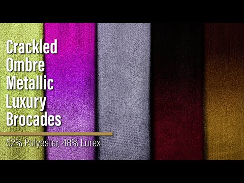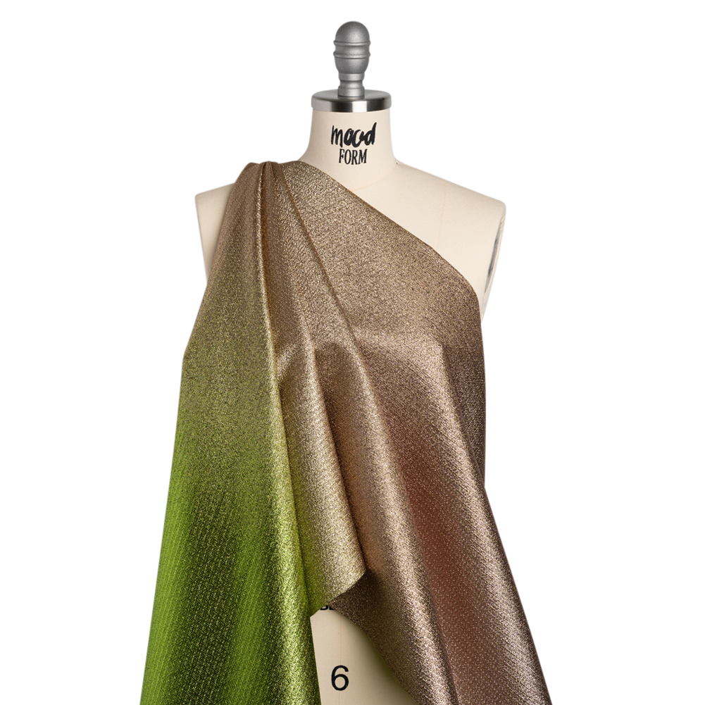 As a fresh lime goes with a margarita, so does this Metallic Lime Green and Gold Crackled Ombre Luxury Brocade go with your next night out—featuring a tactile hand and structured drape.Suggested Projects: Gowns, Skirts, Jackets, VestsContent: 52% Polyester, 48% LurexStretch: NoneOpacity: OpaqueThis metallic luxury brocade demands attention. Its crackled ombre design shifts seamlessly from vibrant lime green to radiant gold, creating a mesmerizing, glitter-esque effect (with the inverse ombre on the other side). With a tactile, grainy hand and structural, nearly-stiff drape, use this brocade to create voluminous gowns, structured jackets, circle skirts, vests, and more! Though opaque, we recommend using a lining for increased comfort.