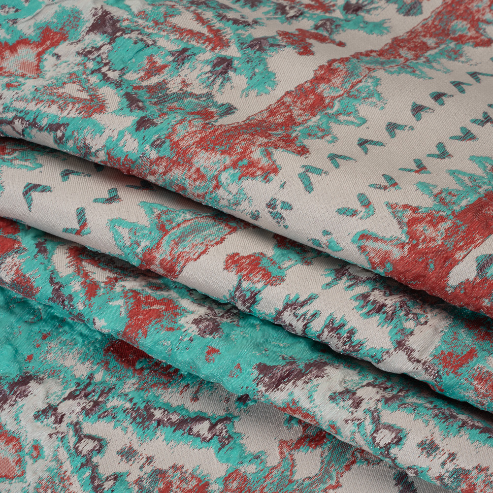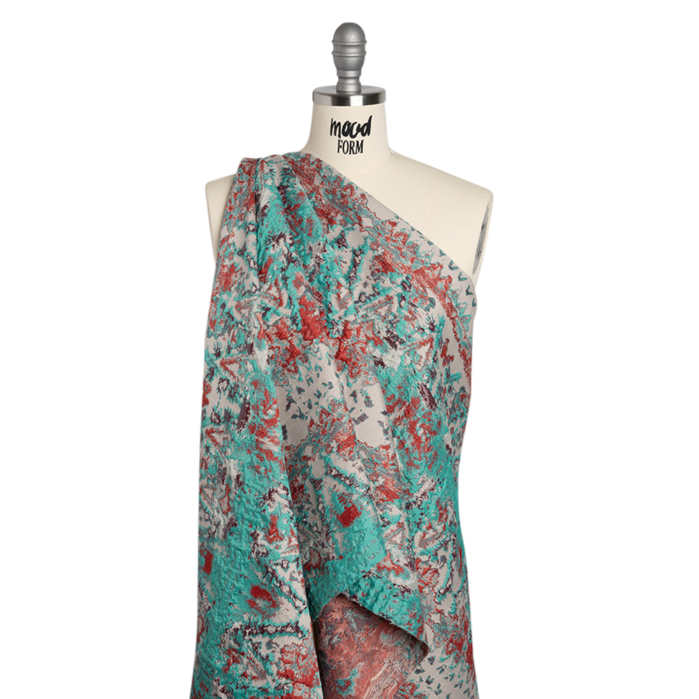 Get red-y for your time in the spotlight in this Red, Turquoise and Cream Rorschach Stripes Metallic Luxury Brocade—featuring a tactile hand and semi-structured, voluminous drape.Suggested Projects: Dresses, Skirts, Jackets, VestsContent: 88% Polyester, 12% LurexStretch: NoneOpacity: OpaqueWhat design possibilities do you see atop this metallic luxury brocade? Woven with additional weft threads, this brocade has a dimensional face; the beige background has a ribbed texture, hosting raised red and turquoise stripes and splatters—inspired by abstract Rorschach test inkblots. Semi-structured and voluminous, the drape lends itself wonderfully to stunning ball gowns, circle skirts, structured jackets, and spiffy vests. For extra luxury, we suggest lining this fabric.