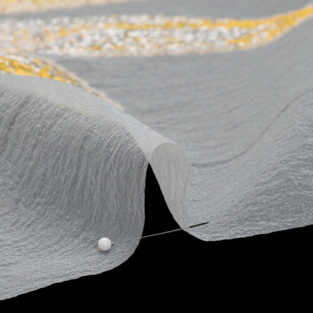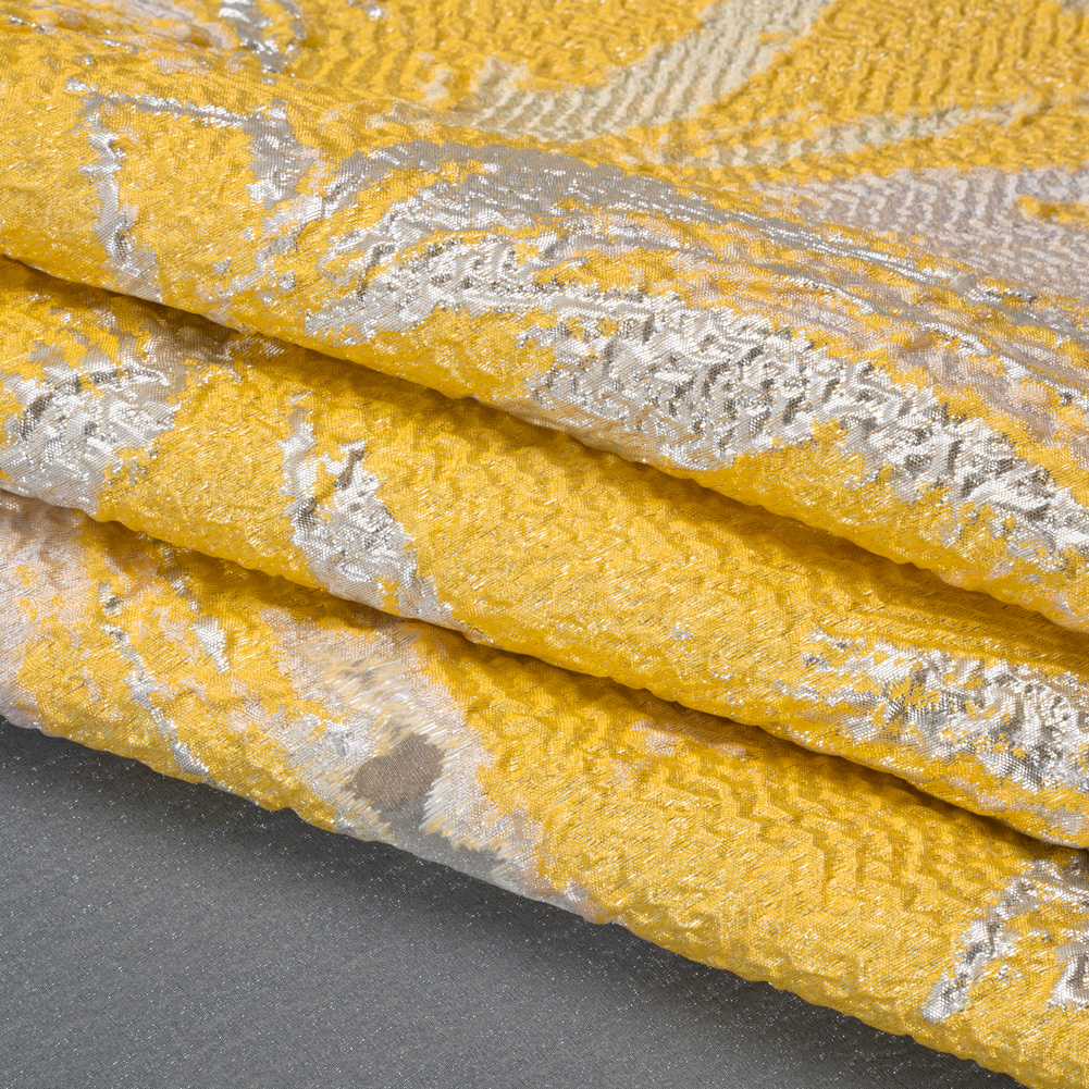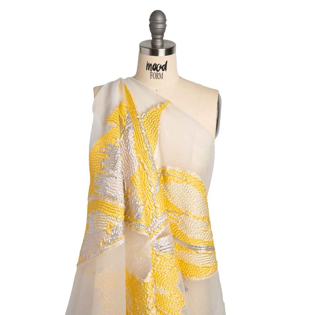 Your inner artist will bloom when you see this Painterly Lily Metallic Luxury Burnout Brocade Panel. With a grainy hand and semi-structured drape, it’s ideal as an overlay for truly stunning eveningwear.Suggested Projects: Overlays for Gowns, Skirts, JacketsContent: 68% Rayon, 21% Polyester, 11% LurexStretch: NoneOpacity: SheerA sunshine yellow and white brocade painterly lily unfurls its petals atop a white, sheer burnout. With a grainy hand and semi-structured drape, use it as an overlay for billowing gowns, voluminous skirts, and breathtaking dinner jackets. Sheer, we suggest use as an overlay or with a luxurious silk habotai lining to emphasize its decadence. Please Note: This design is a panel that spans 1.5 yards.