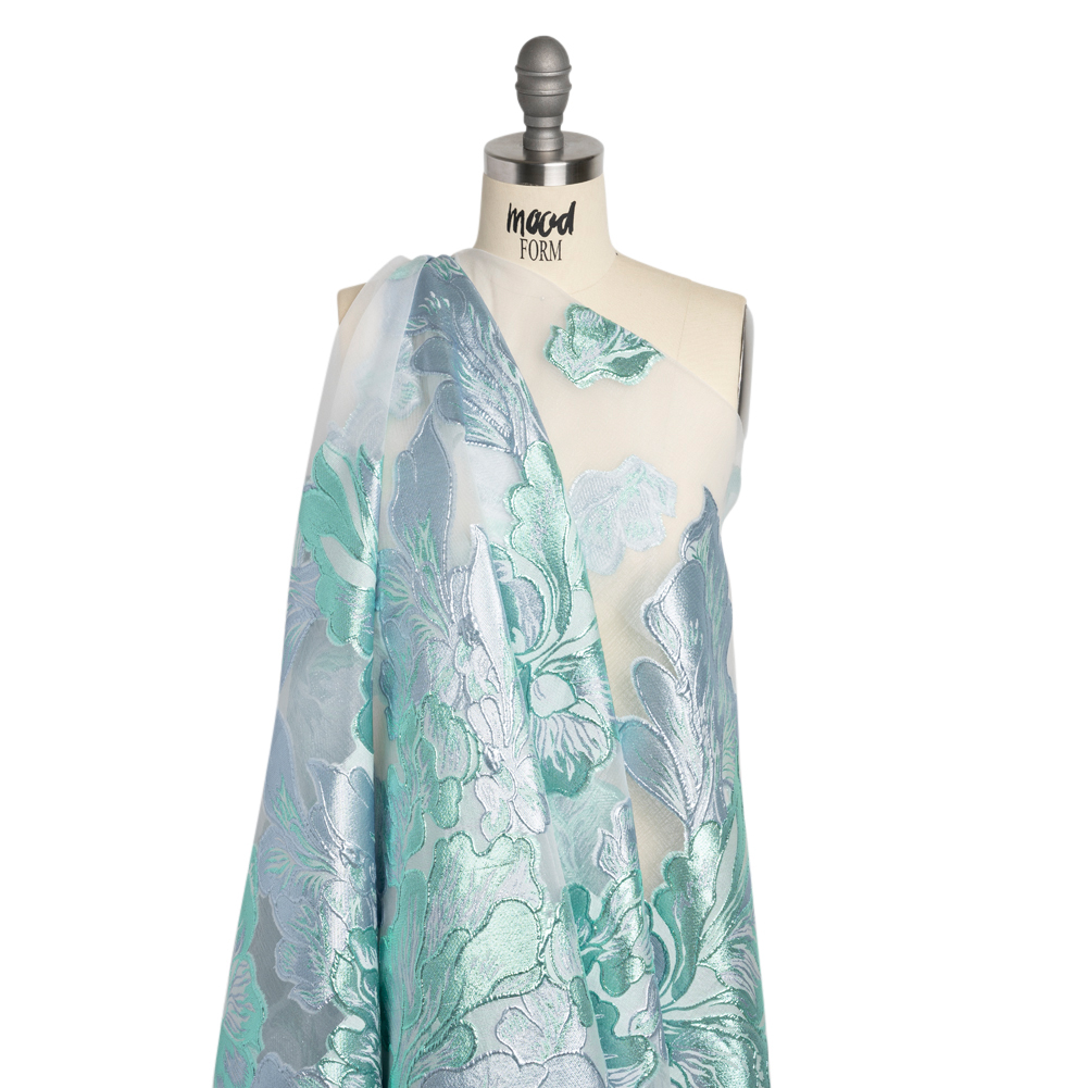 Cast a chilling spell over your next formalwear sewing project with our magical Metallic Turquoise, Baby Blue and White Floral Luxury Burnout Brocade Panel! The magnificence of the teal and blue metallic threading matches the sheer magnitude of the flowers, displayed on a breathtaking panel measuring 61” by 62”. The feel of the flowers is sleek, grainy, and three-dimensional as they rise slightly from the puckered white mesh. Either as an overlay or paired with a silk habotai lining, this semi-structured fabric conjures up dream-like ball gowns, voluminous circle skirts, and more.
