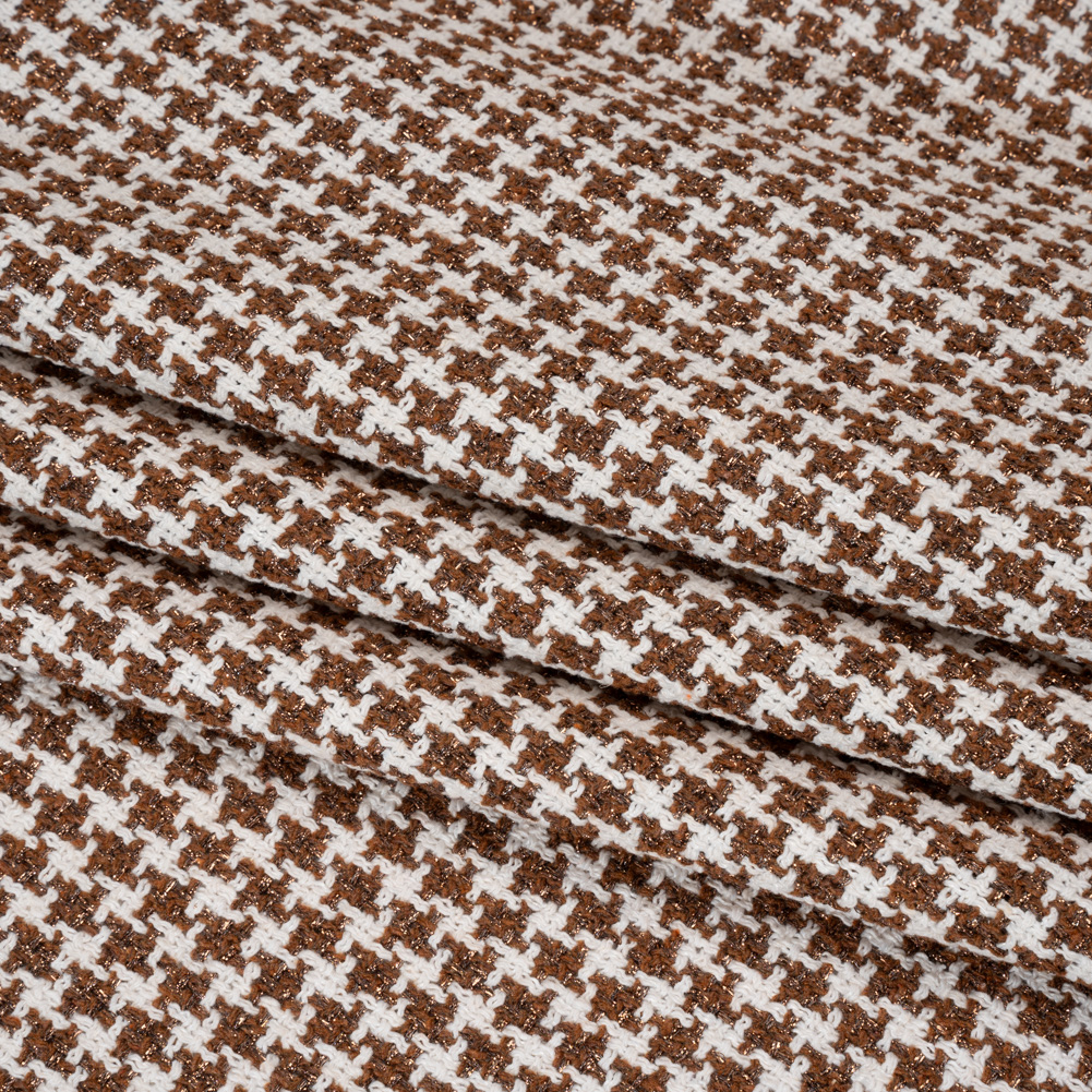 Delicious confections are easy to bake with this White and Brown Houndstooth Metallic Tweed—featuring a tactile hand and supple drape.Suggested Projects: Jackets, Skirts, Blazers, CoatsContent: Acrylic, LurexStretch: NoneOpacity: Slightly TranslucentSweeten your wardrobe with this metallic tweed. Tweed is often seen on runways or at high-profile events as its famously dimensional face and nubby texture create statement pieces for every age, gender, and period. In this case, white and metallic brown threads weave together to create a houndstooth design. It features a supple drape and tactile hand, ideal for Chanel-inspired jackets, chic blazers with matching pencil skirts, and belted coats. Slightly translucent, we recommend a lining for opacity, comfort, and warmth.
