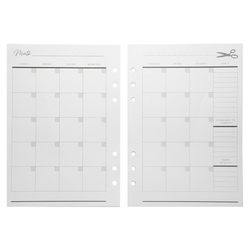 Keep up your organizational streak with our Mood Designer Sewing Planner Undated Monthly Calendar Refills! This package contains 12 undated monthly calendars, each stretching across two pages so you can see them while your planner lays flat—for a total of 24 pages—with the backs of the pages featuring dot grids for notes. Designed for the Mood Designer Sewing Planner, these pages (each measuring about 5.82 inches by 8.26 inches) fit a standard 6-ring A5 binder for maximum versatility, perfect for the designer on the go.A new year can start whenever you’re ready to get organized thanks to these undated pages, with plenty of space and flexibility for designers, students, home sewists, and more! If you need more project planning space, we’ve got Project Page Refills, too!