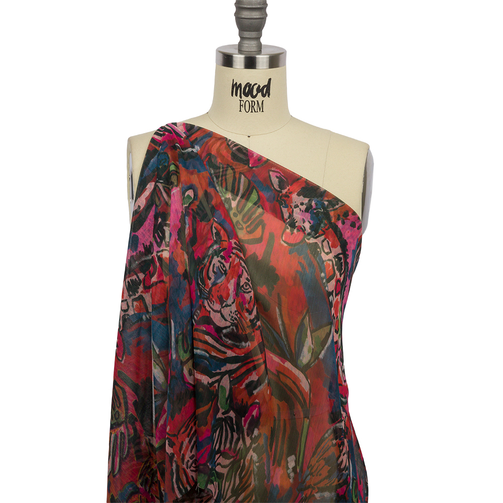 Discover the hidden beast within this Mood Exclusive Blending Beasts Crinkled Polyester Chiffon. Boldly colored leaves, tigers, zebras, giraffes, and parrots seek to hide between each other in a design that's sure to stand out. With a dry, crinkled hand and fluid drape, design overlays for evening gowns, bridesmaid dresses, high fashion dresses, scarves, skirts, and sheer blouses. Sheer and without stretch, a lining may be added for opacity and structure where desired.