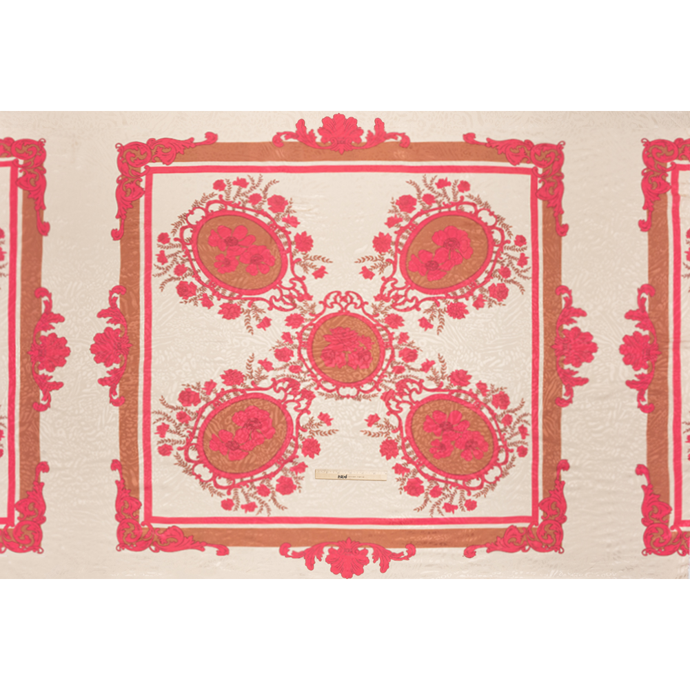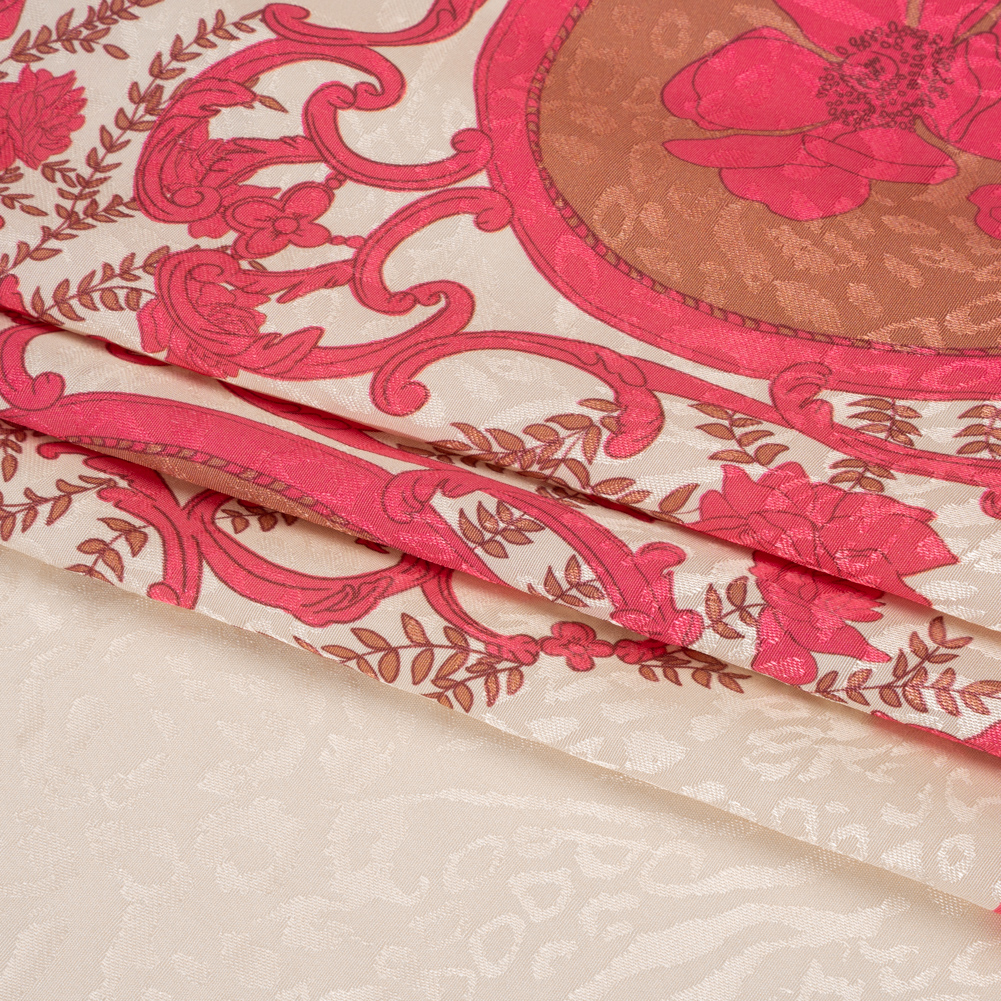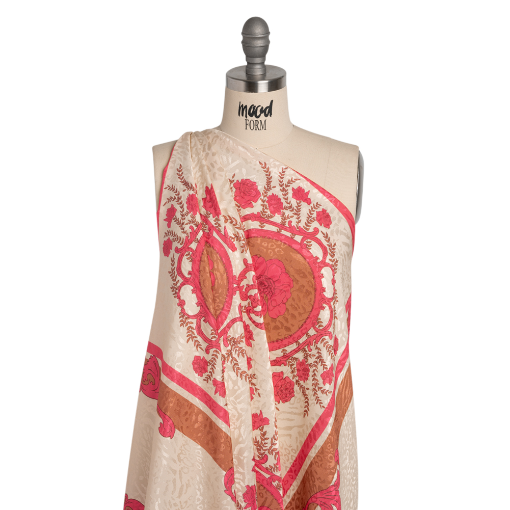 Powder your nose and spritz your fragrance; our Mood Exclusive Eau de Cologne Animal Rayon Jacquard Panel sets you up for a night of beauty. A mauve frame, decorated with hot pink scrolls, borders ornate mirrors reflecting and surrounded by pink flowers. Raised cheetah spots decorate the face of this eco-friendly fabric, bringing just the right amount of animal print to your formalwear looks. They texture the sleek hand with a subtle dimension, catching the light with an elegant luster as well.Thanks to their complex weave, Jacquards are lauded for keeping the little details in mind as they elevate looks and turn heads. Feeling cool against your skin and falling with a supple drape, this fabric is ideal for dinners in semi-structured blazers and special occasions in dresses. Translucent, a lining may be desired depending on the project. Please note: This panel measures 57" wide by 40" long.