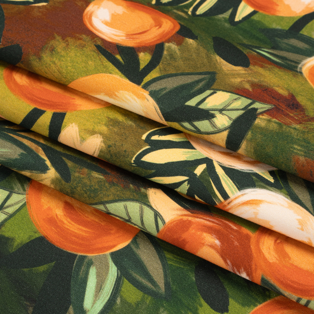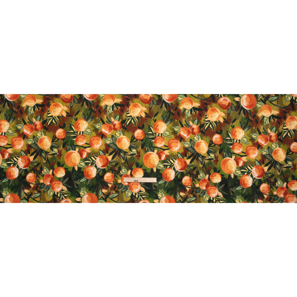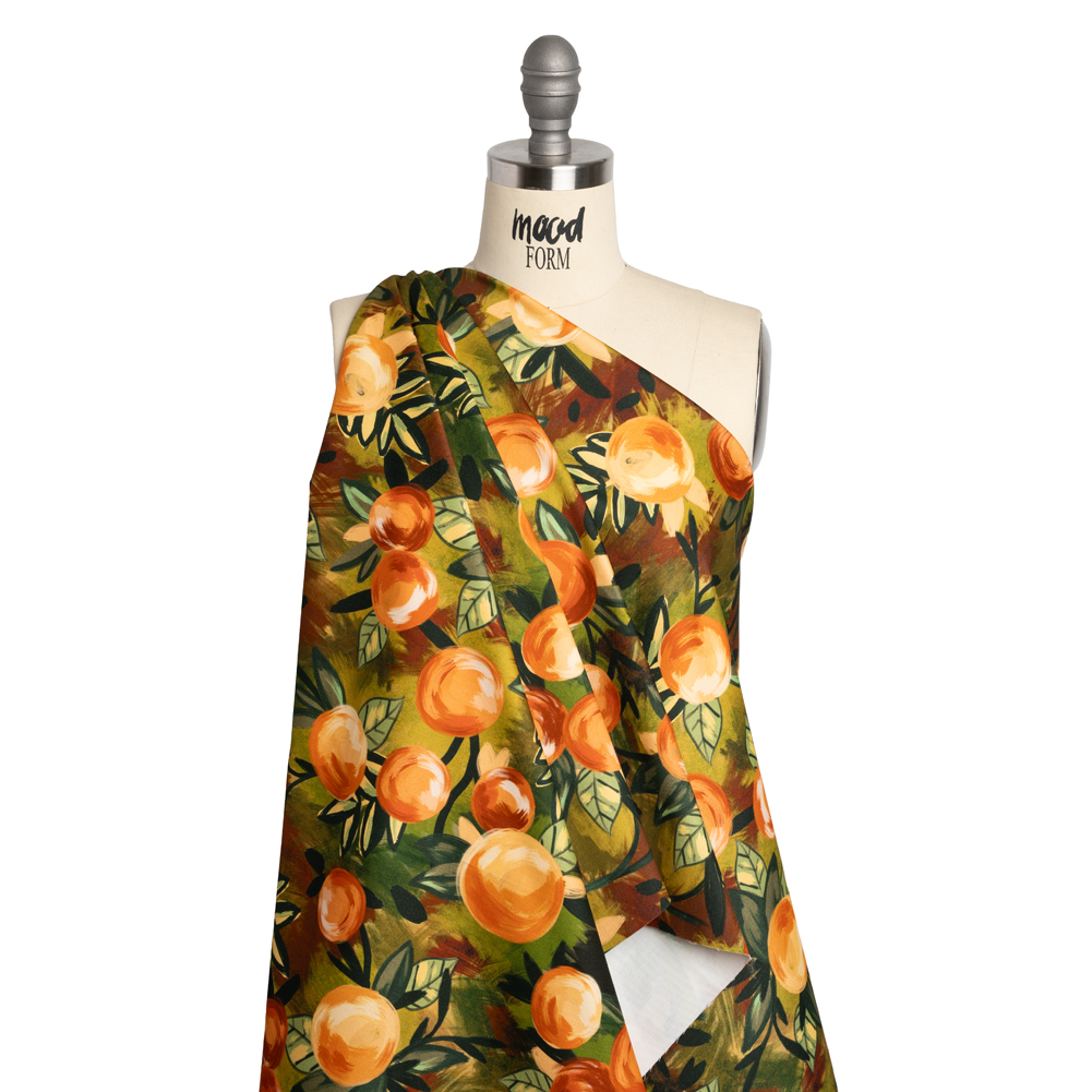Nurtured by the soil and the sun, our Mood Exclusive Orange Zest Grove Stretch Brushed Cotton Woven grows among the shadows. Orange trees boast their hand-painted harvest against a busy background of green and brown brushstrokes. This fabric has been brushed to exaggerate the fibers in the face, creating a plush, dry hand. It features a 10% weft-wise stretch, perfect for moving throughout your day, and a malleable drape, ideal for cigarette pants, sheath dresses, lightweight jackets, and more! Mostly opaque; depending on the application, a lining may be desired for added structure.