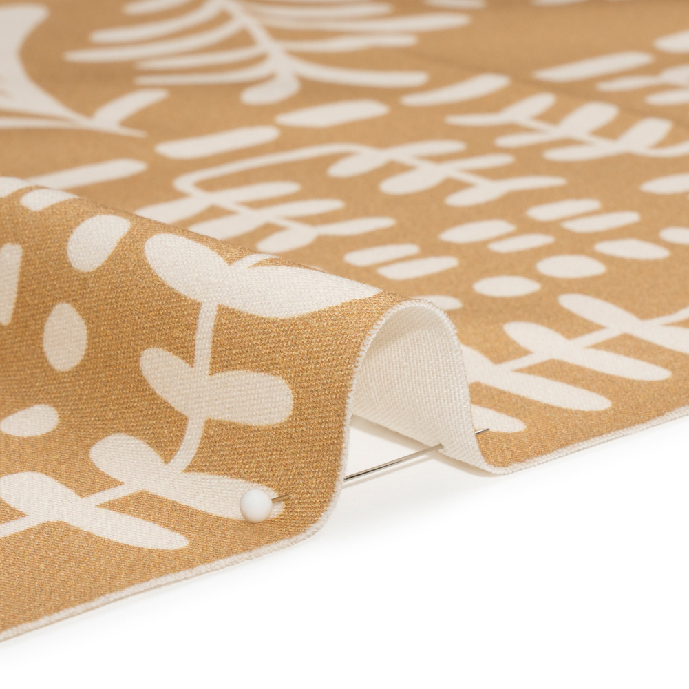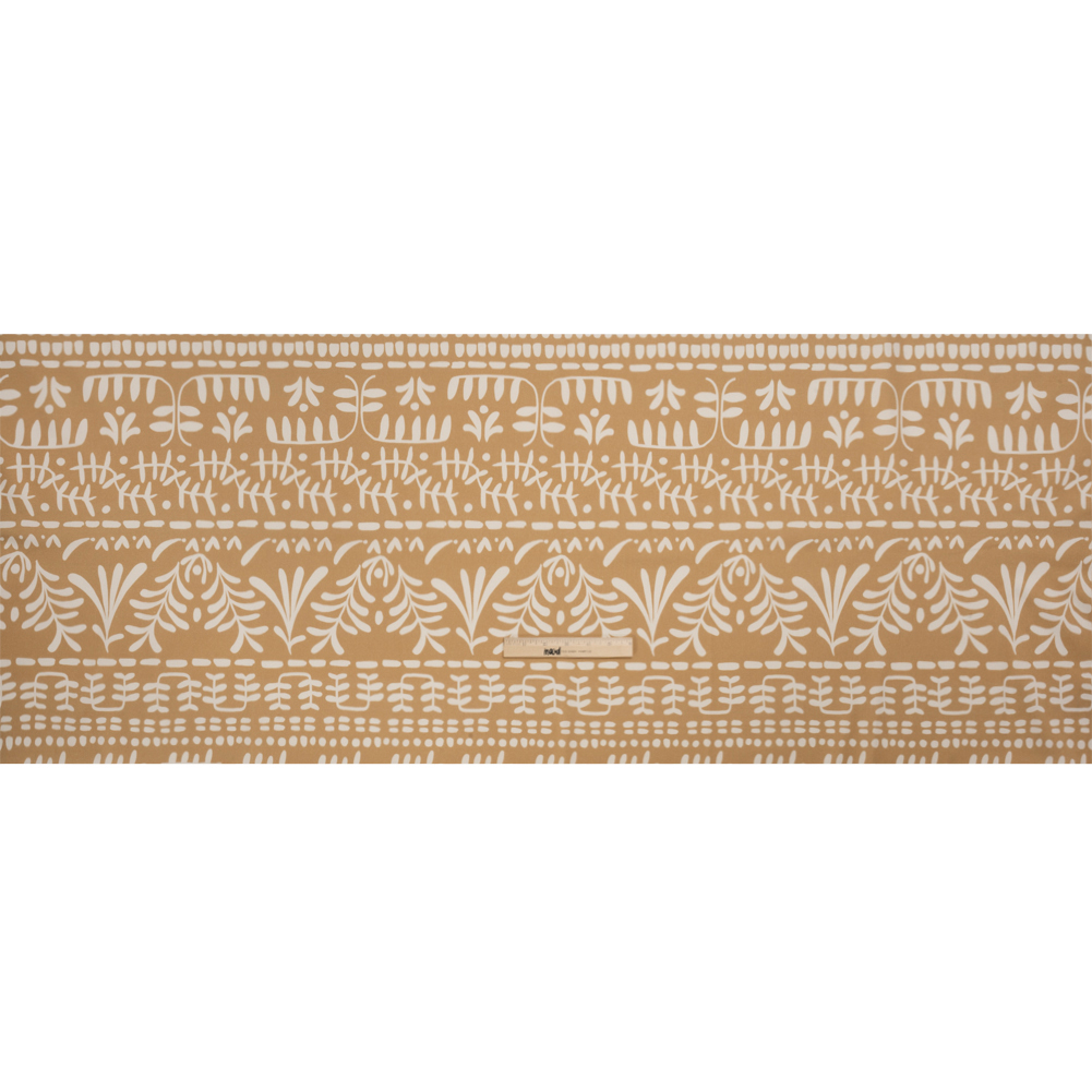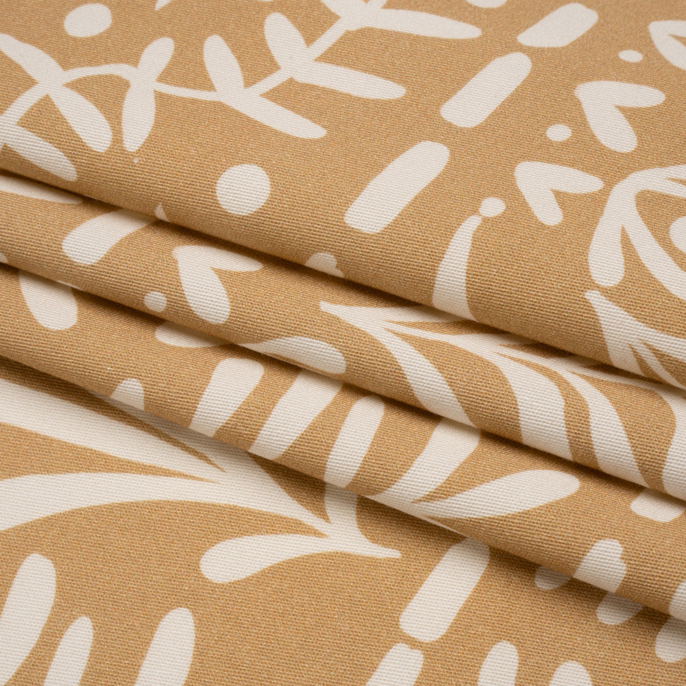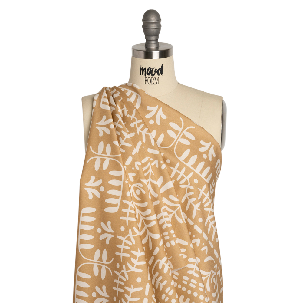 Paying homage to the simple sights of nature, our Mood Exclusive Tan Vegetation View Stretch Cotton Twill introduces a unique and calm pattern to your wardrobe. Against a tan backdrop, simple cream shapes form pathways through symmetrical branches, boughs, and brambles. Boasting a slight sheen, this cotton twill has a pebbly, dry hand and a malleable drape. With a 10% weftwise stretch, you will find comfortable movement in chinos, button-down skirts, lightweight jackets, and more! While opaque, a lining may be desired for added comfort and structure.