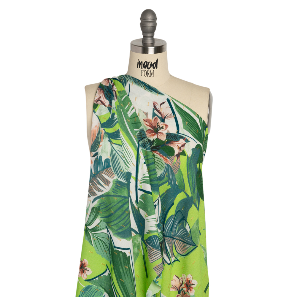 Our Mood Exclusive White Jive with Jungle Metallic Dotted Crinkled Viscose Crepe cures your jungle fever with its lush palm leaves and flowers against a lime green and white background. The crinkled face, decorated with rows of metallic gold dots, displays the most distinguishable characteristic of a crepe: a grainy and crisp hand. Its rippling drape compliments semi-casual silhouettes as its cool, medium-weight feel is perfect for all climates; airy skirts, a-line sundresses, and workday blouses are just the beginning of what you can make with this fabric! Slightly transparent—a lining may be desired.Here are a few tips from our sewists to master crepe’s unique texture:Lower the thread tension on your sewing machine to prevent puckeringUse a new, fine point needleTo prevent slipping during cutting, line up your pieces with the pattern pieces, cut in single layers, and use a rotary cutter or tabletop scissorsBe patient and have fun!