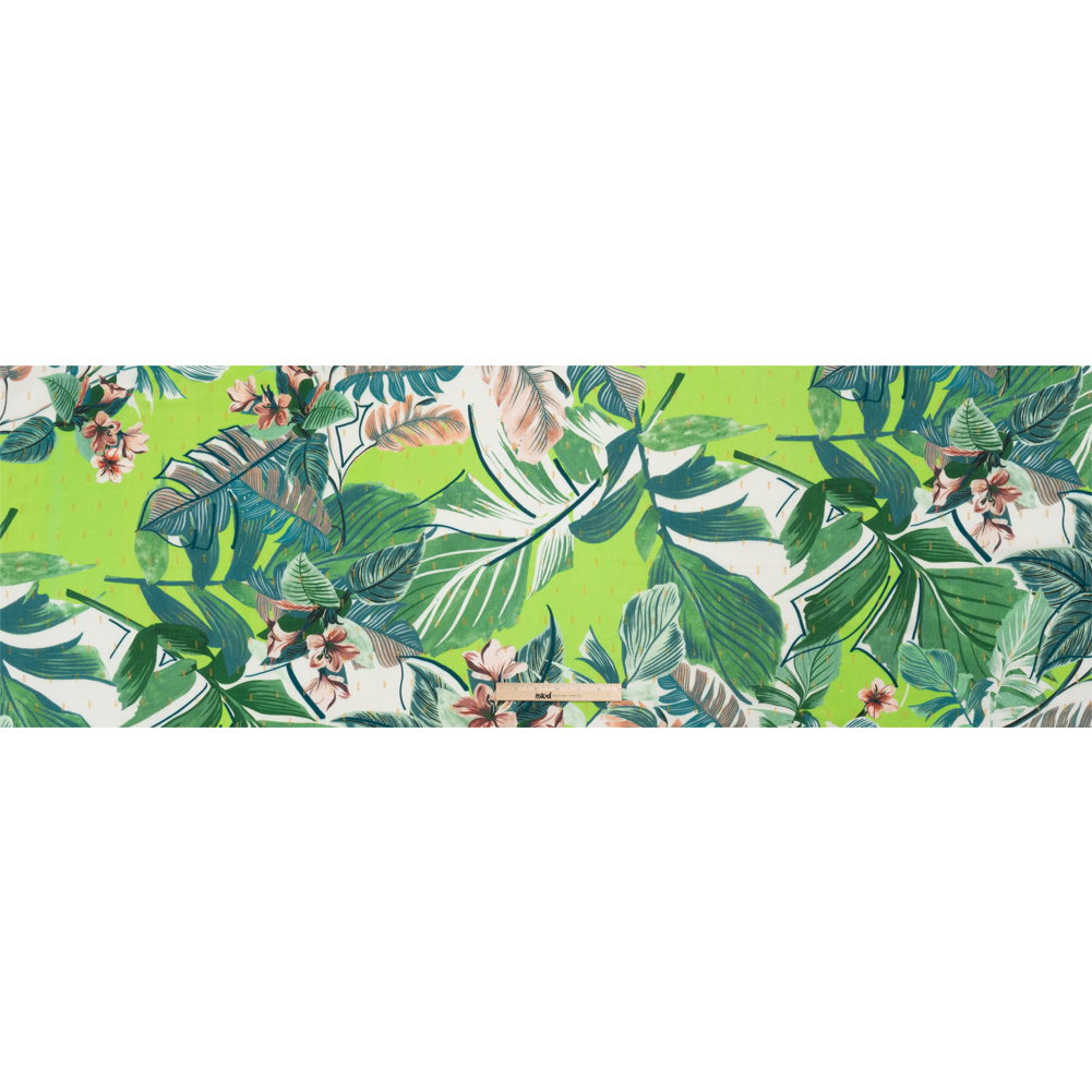 Our Mood Exclusive White Jive with Jungle Metallic Dotted Crinkled Viscose Crepe cures your jungle fever with its lush palm leaves and flowers against a lime green and white background.