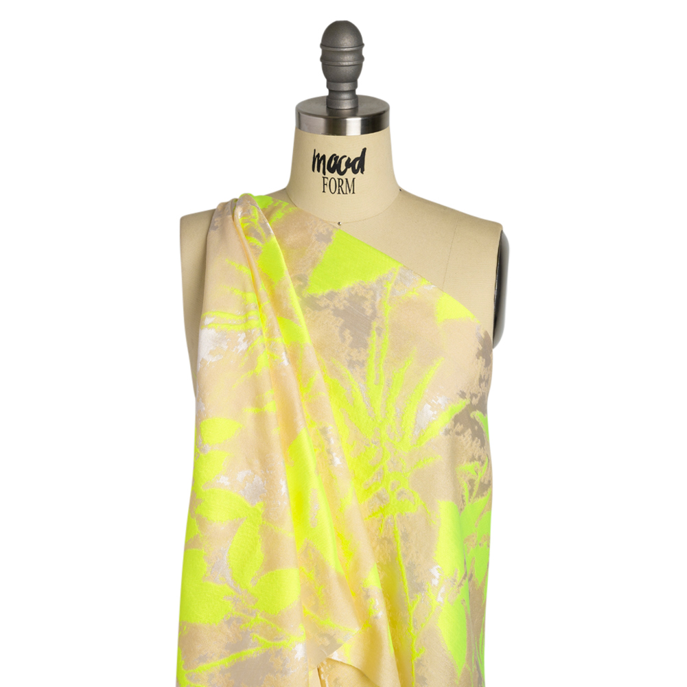 This Neon Yellow, White and Beige Soft Leaves Lightweight Polyester and Viscose Luxury Brocade will be the highlight of your night! Images of abstract neon yellow leaves and branches peek through a pale beige sky as lustrous white lines crisscross in the background. The colored sections bring dimension and a sleek texture to the slightly grainy and cool hand. This lightweight brocade falls with an easy drape, conjuring images of semi-structured silhouettes and long, flowing garments. Create structured blazers, handkerchief skirts, perfectly tailored gowns, and more! As this fabric is slightly translucent, we suggest lining it with our silk habotai linings for added opacity and luxury!