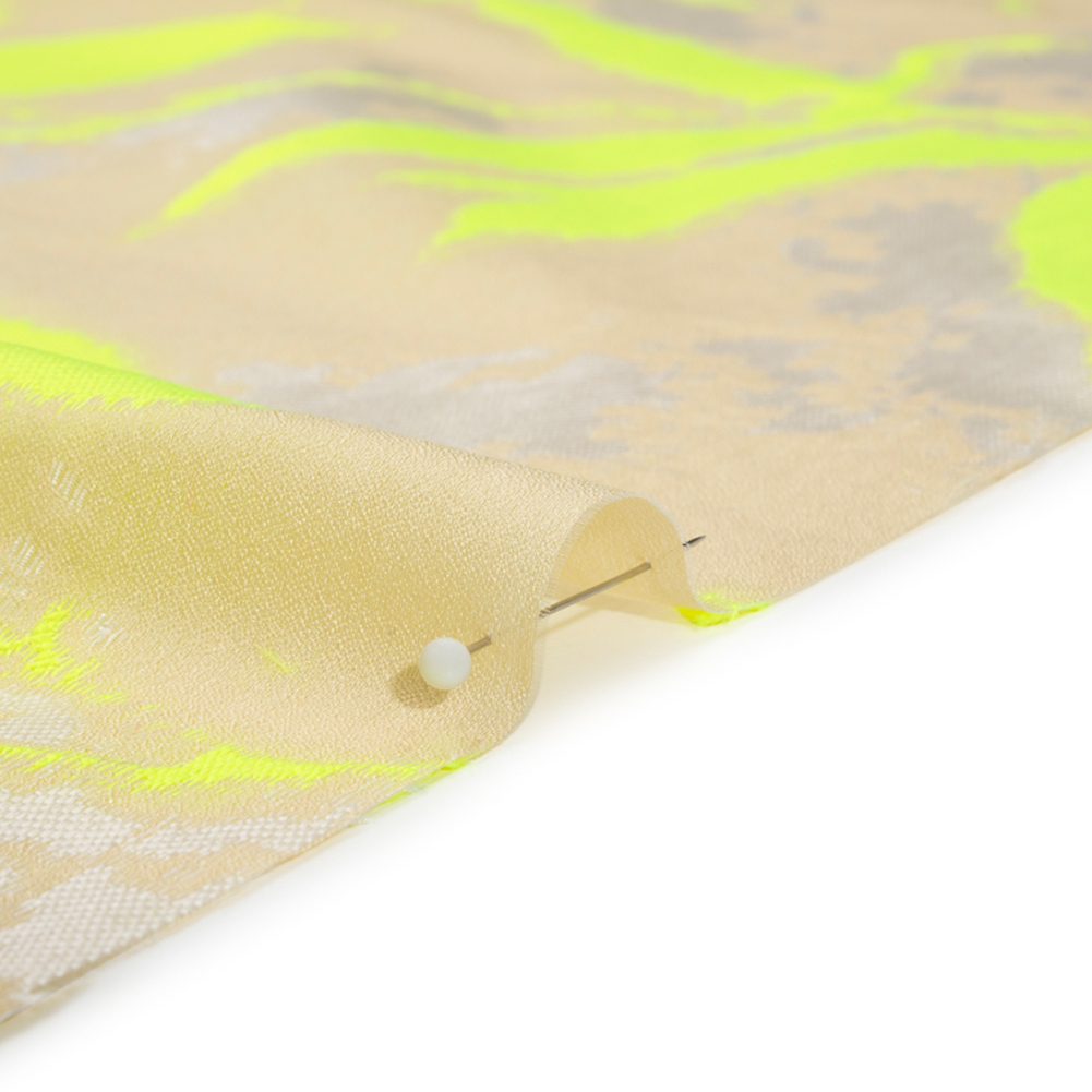 This Neon Yellow, White and Beige Soft Leaves Lightweight Polyester and Viscose Luxury Brocade will be the highlight of your night! Images of abstract neon yellow leaves and branches peek through a pale beige sky as lustrous white lines crisscross in the background.