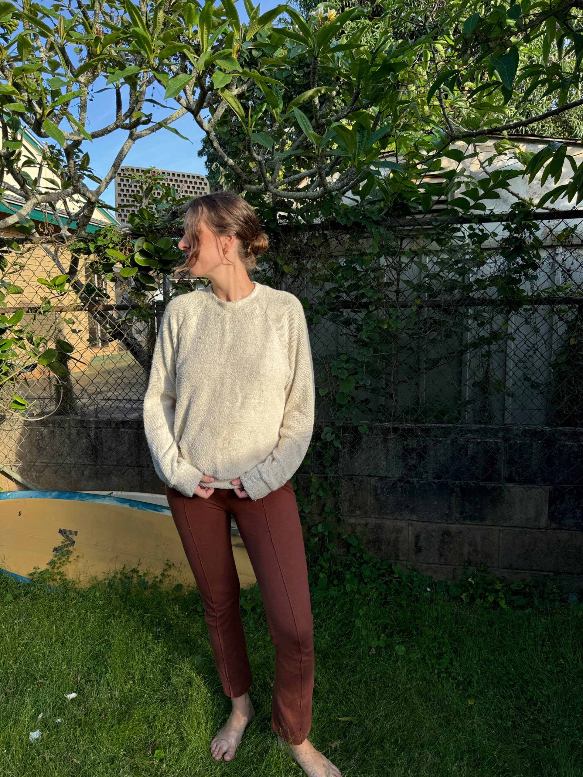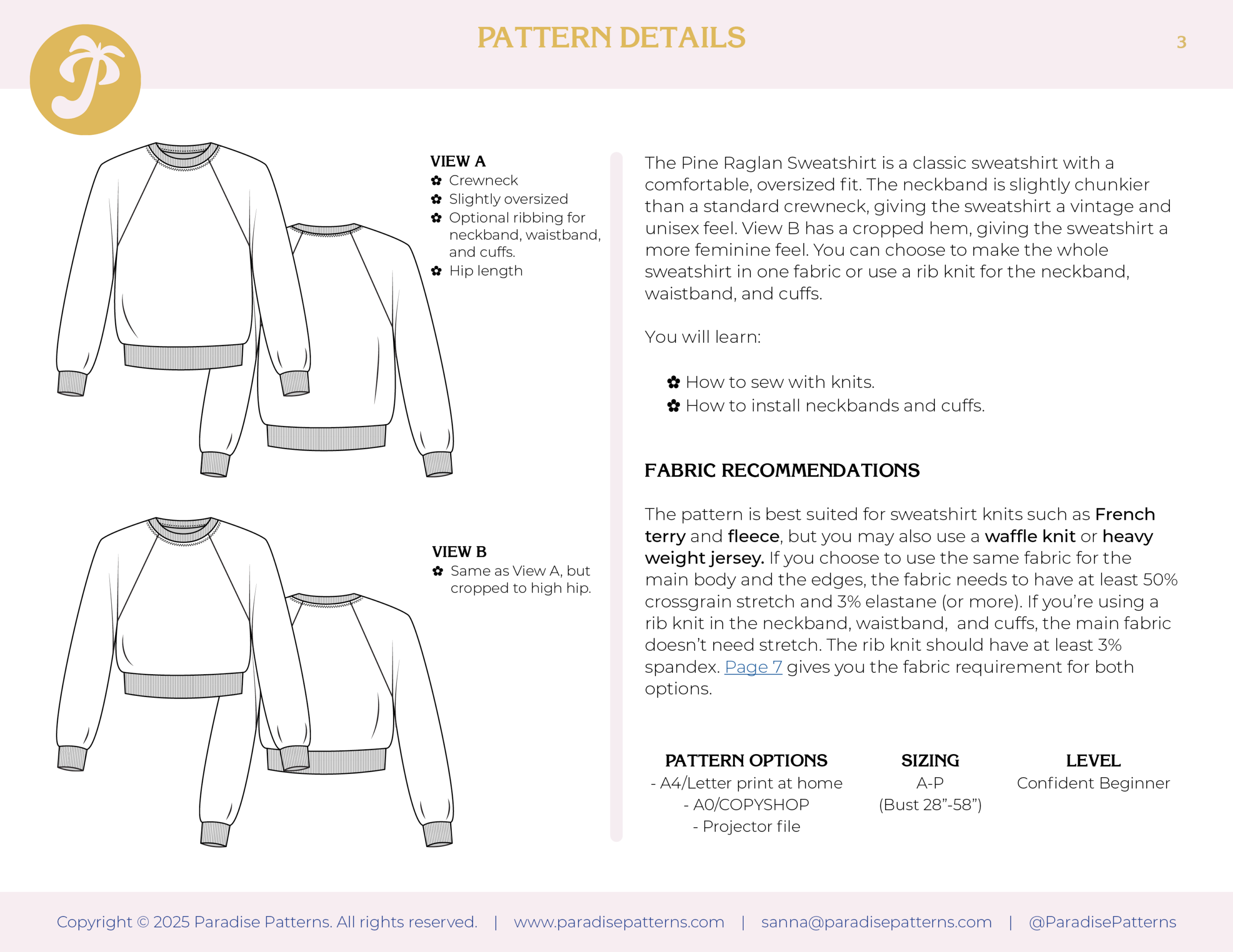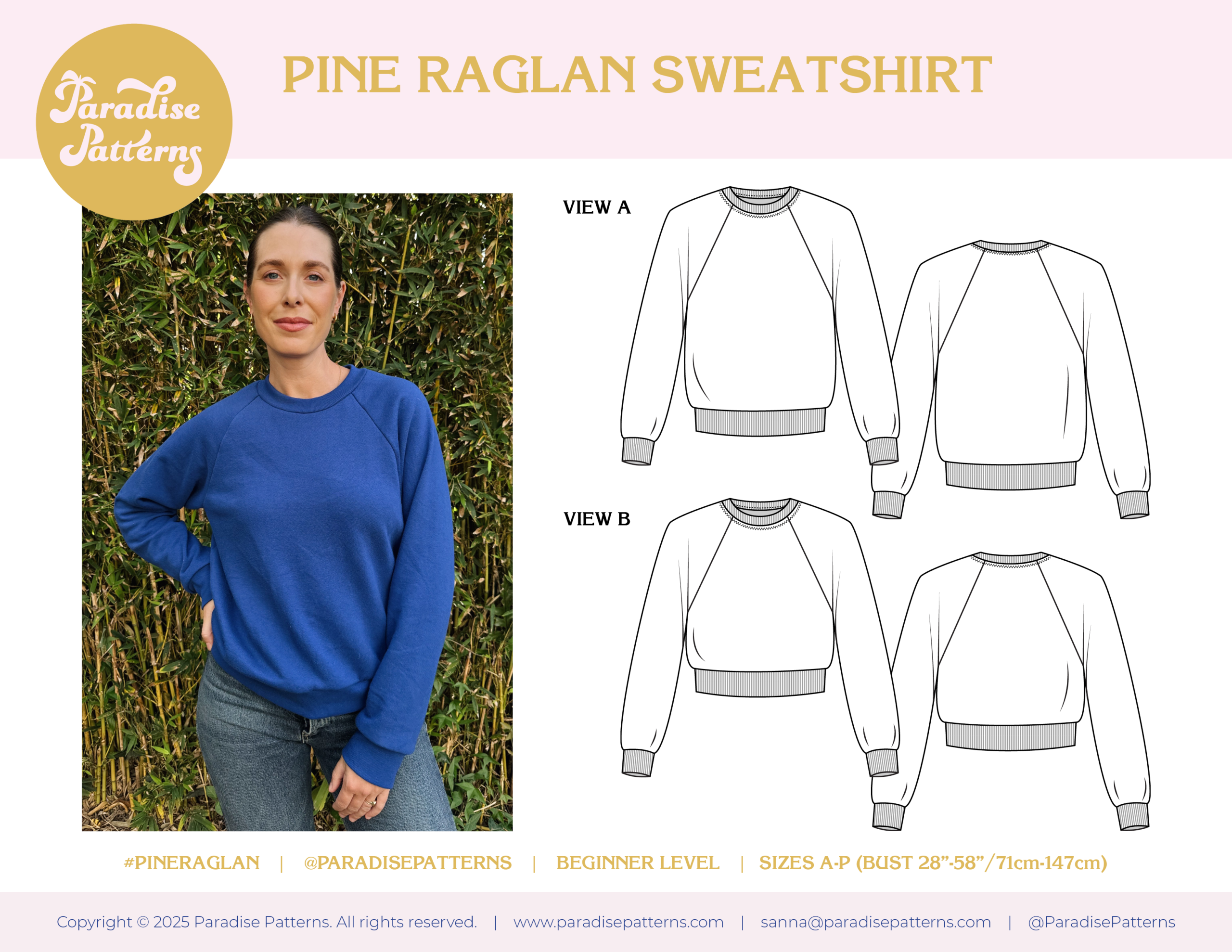 The Pine Raglan Sweatshirt is a classic sweatshirt with a comfortable, oversized fit. The neckband is slightly chunkier than a standard crewneck, giving the sweatshirt a vintage and unisex feel. View B has a cropped hem, giving the sweatshirt a more feminine feel. You can choose to make the whole sweatshirt in one fabric or use a rib knit for the neckband, waistband, and cuffs.ย