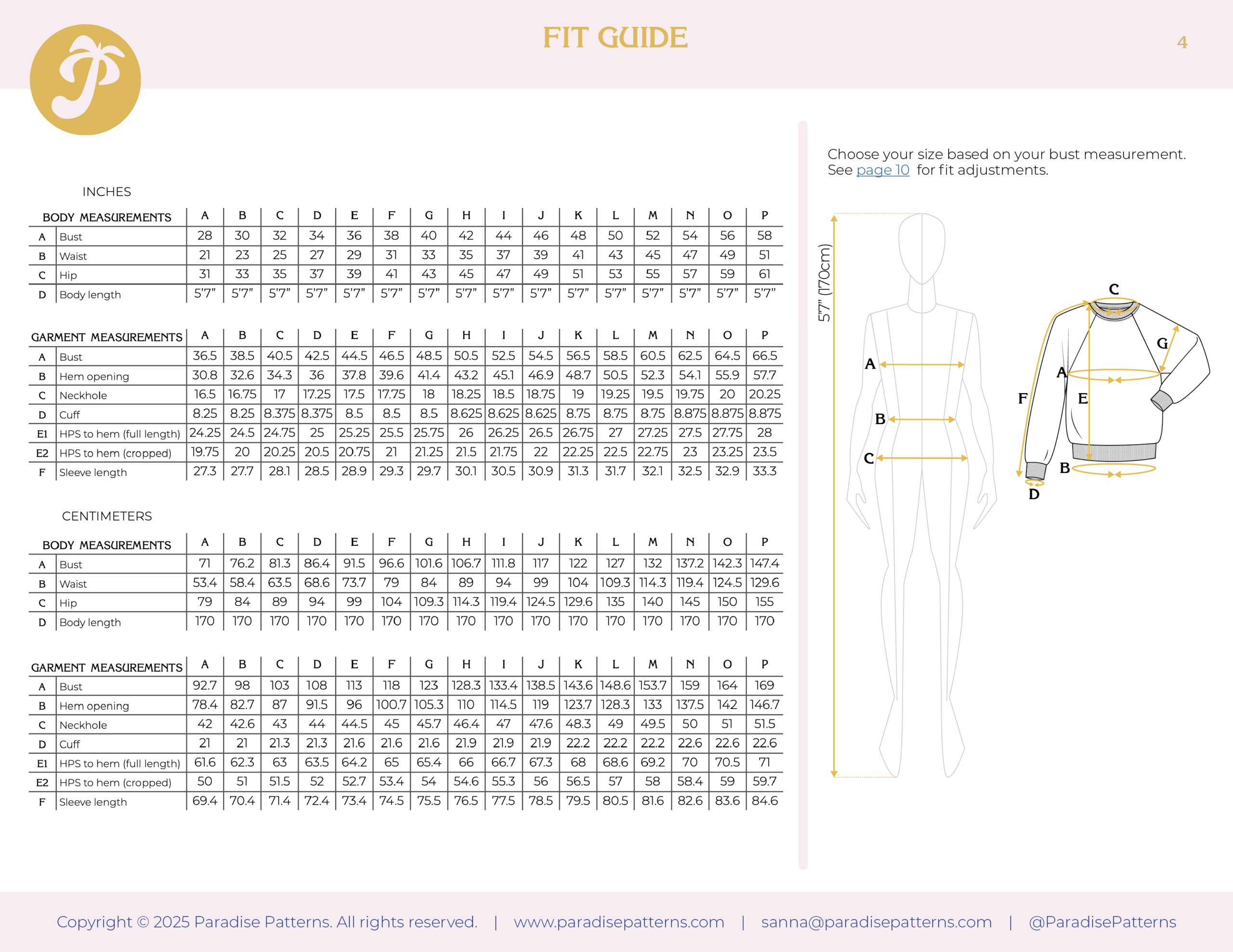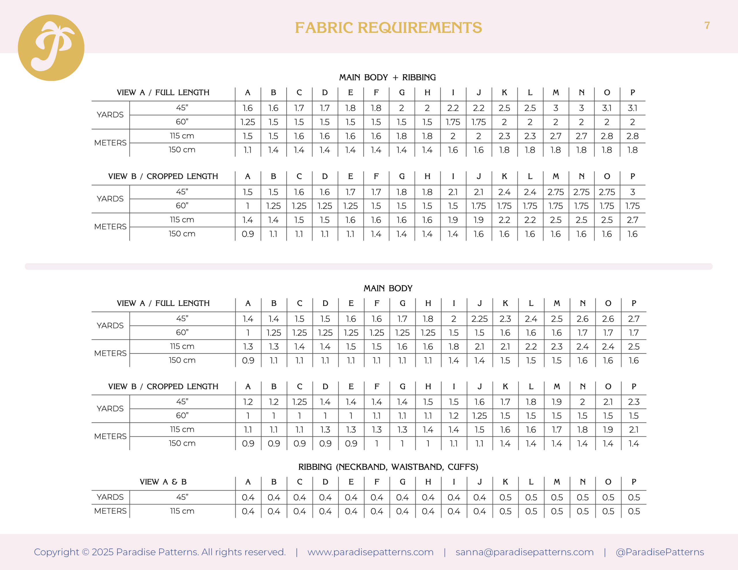 The pattern is best suited for sweatshirt knits such as French terry and fleece, but you may also use a waffle knit or heavy weight jersey. If you choose to use the same fabric for the main body and the edges, the fabric needs to have at least 50% crossgrain stretch and 3% elastane (or more). If youโre using a rib knit in the neckband, waistband, and cuffs, the main fabric doesnโt need stretch. The rib knit should have at least 3% spandex. Page 7 gives you the fabric requirement for both options.