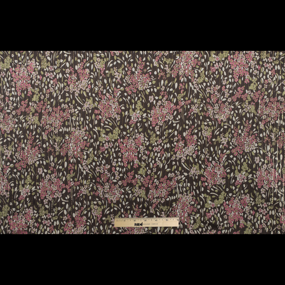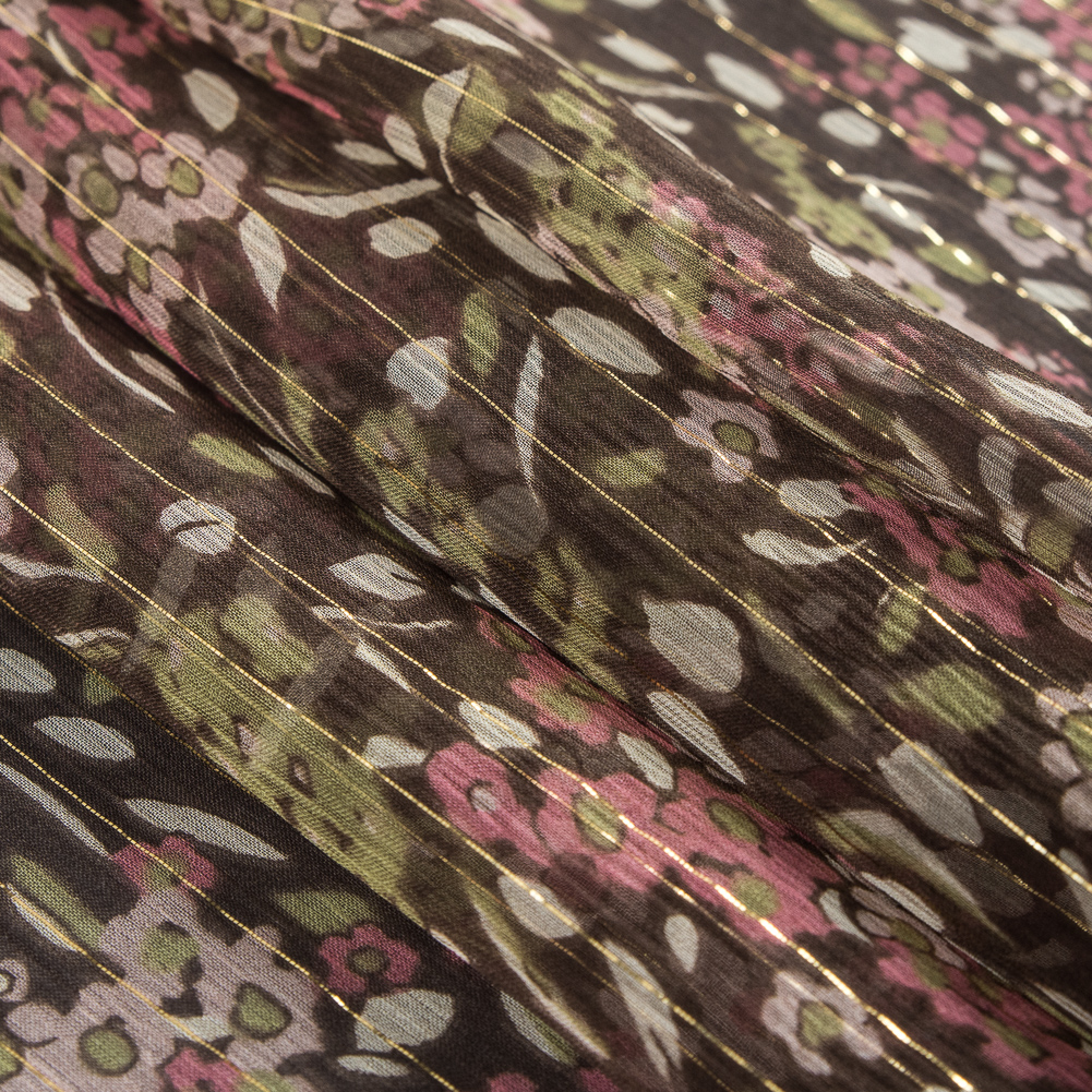 Pink/Green/Brown Floral Printed Crinkled Silk Chiffon w/ Metallic Gold Stripes